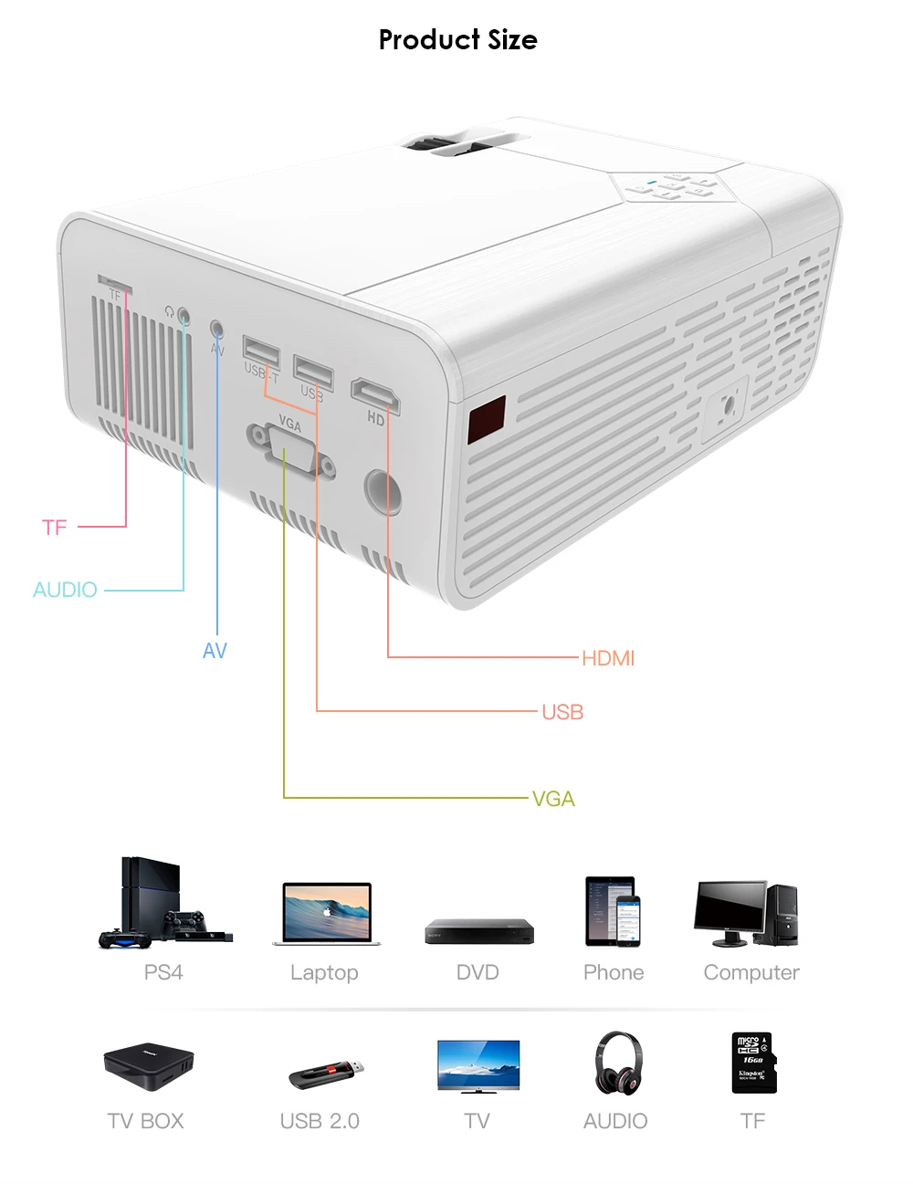 Варианты: Модель: A13 Разрешение: 1280*720p, (поддержка 1920*1080p) Контрастность: 2000: 1 Коррекция Keystone: вертикальная: +/- 15 ° Светодиодный срок службы: 50000 часов Люмен: 3000 люмен Люмены Ansi: 300 люменов Ansi Размер проекционного экрана (дюйм): 40-150 дюймов Расстояние проекции (м): 1,0 ~ 4 метра Формат изображения: Jpge /./ bmp. Png / gif. Формат видео: Dat /. Mpg /. Mpeg /. Avi mp4.rm /. Rmvb. МкВ/. Mov. Ts /. Tp /. m2ts /. Vob Формат аудио: Mp3 / wma. /. m4a