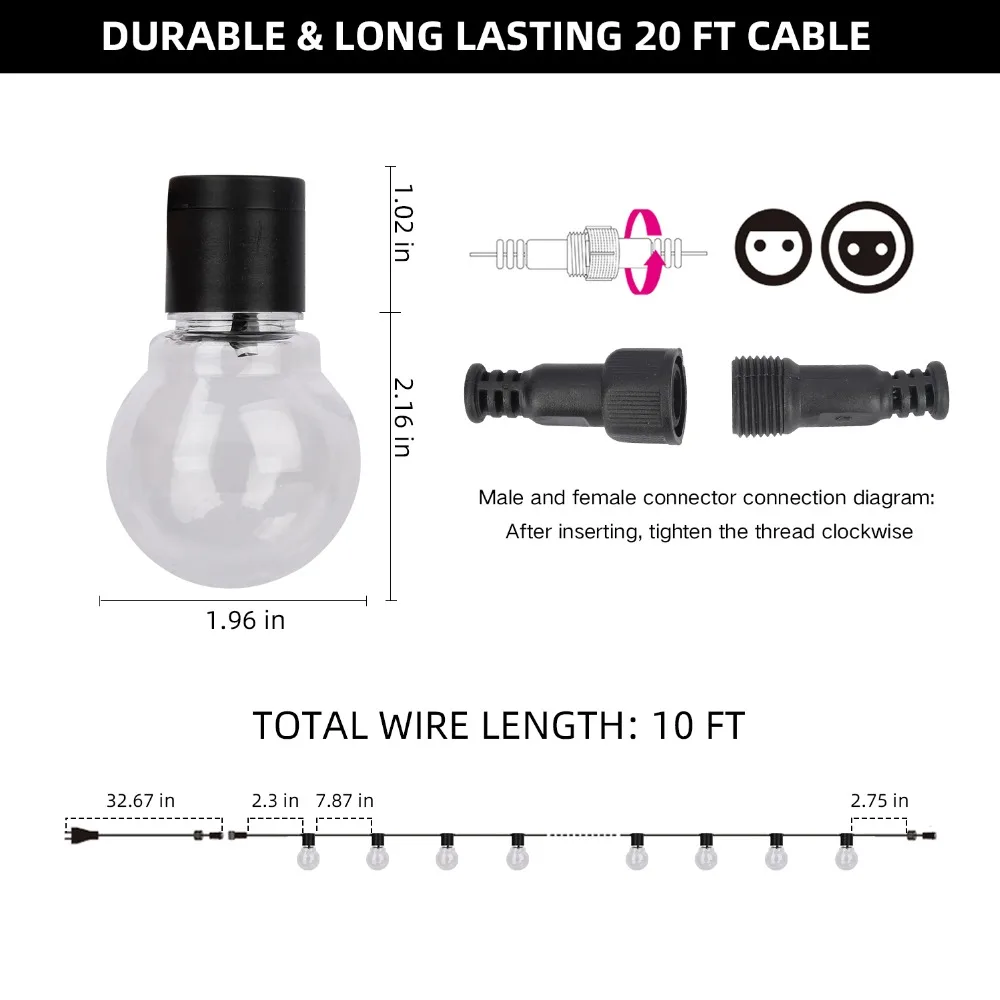 Примечание: Чтобы обеспечить качество и срок службы, подключается светильник globe string, может быть подключен максимум 5 шт. 20ft string светильник (Максимум 40 м)