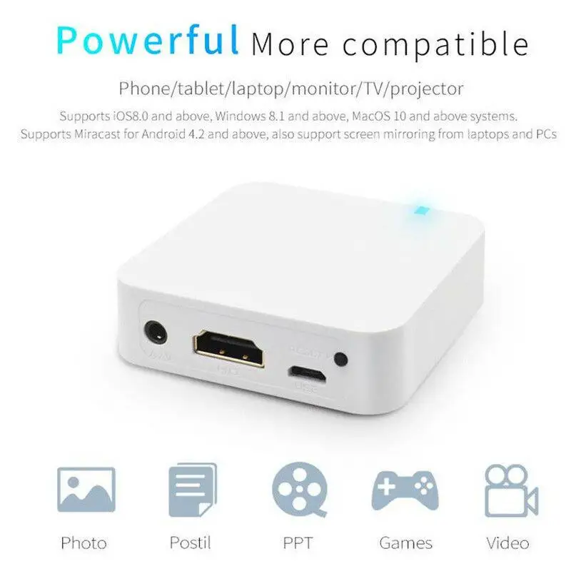 Поддержка Airplay, Miracast, Allsharecast, зеркального отображения экрана и DLNA. 720 / 1080P HD выход, наслаждайтесь хорошим качеством.