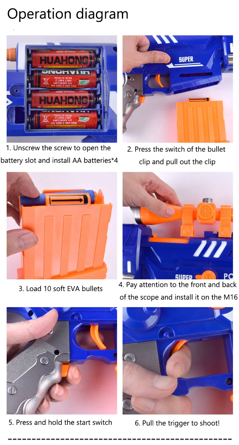Рулетка страйкбола пистолет Размер: 57*25 см Батарея: AA батарея * 6 Диапазон: 5-10 метров Продукты включают: рулетка страйкбола пистолет * 1, EVA Мягкая Пуля * 40, цель * 1 M16 электрическое Страйкбольное Оружие Размер: 79*27,5 см Батарея: AA батарея * 4 Диапазон: 5-10 метров Продукты включают: M16 электрическое Страйкбольное Оружие, EVA Мягкая Пуля * 20, цель * 1 Револьвер страйкбол пистолет Размер: 30*18 см Батарея: батарея не требуется Ассортимент продукции: 5-10 метров Максимальное количество бомб: 6 Продукты включают: револьвер страйкбола пистолет * 1, EVA Мягкая Пуля * 10