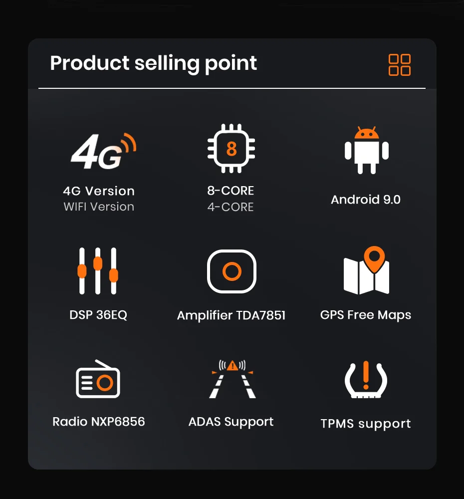 > 9 дюймов 2.5D емкостный Экран + 4 ядра 1,2 ГГц Процессор + DDR3 1 ГБ/2 ГБ/4 ГБ флэш-памяти (опционально) + 16 Гб/32 ГБ/64 Гб памяти (опционально) + встроенный Wifi (4G сеть опционально) + gps-навигация (Бесплатное обновление карты) + управление рулевым колесом + зеркальная связь + Bluetooth + Встроенный микрофон + FM/AM + RDS + Поддержка USB DVR ADAS + Поддержка Европейской DAB функции + 1080P видео воспроизведение + HD 1024*600 + Поддержка контроля давления в шинах Системы