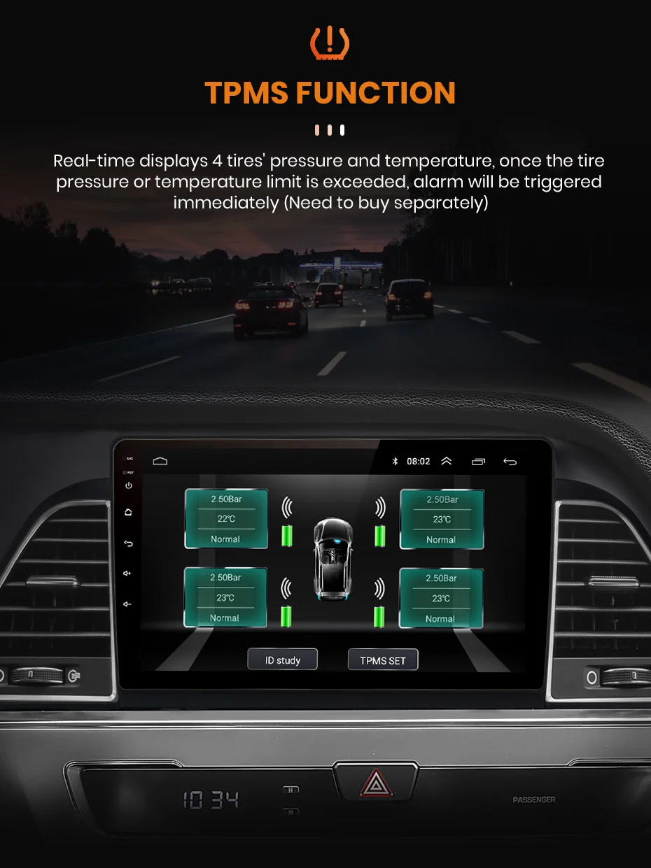 > Отображает 4 давления и температуры в режиме реального времени. Как только давление или температура в шинах будут необычными, сразу же будет сигнал тревоги.