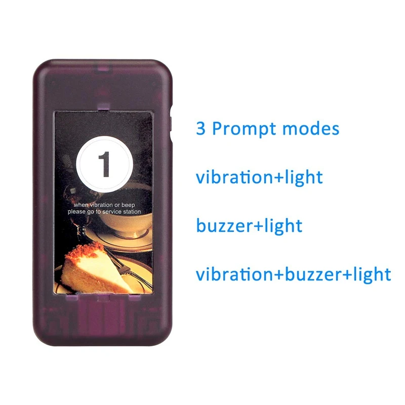Дальность действия; Рабочее расстояние до 1640 футов на открытой местности; 492 фута на открытой местности; 3,7 В 360 мА · ч перезаряжаемая литиевая батарея для пейджера coaster; Избегайте зарядки батареи часто; Срок службы батареи; 72 ч в режиме ожидания; 36 ч в использовании