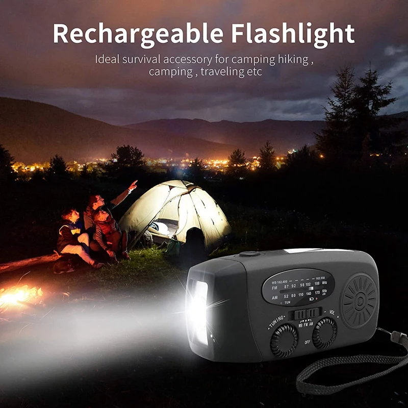 [Радио аварийной погоды]-погодное радио может получать AM/FM/NOAA, оно может своевременно сообщать предупреждения о чрезвычайной погоде в ваших районах, также вы можете слушать вашу любимую радиостанцию. Встроенный литиевый аккумулятор емкостью 1000 мА · ч может поддерживать до 9 часов подсветки фонарика и до 5 часов воспроизведения радио, прочная конструкция чехла с водонепроницаемым IPX3.