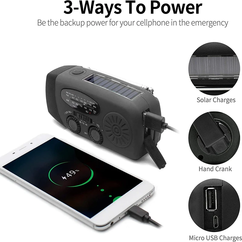 [Три способа подзарядки]-аварийное солнечное ручное радио может быть зарядным устройством с помощью солнечной панели, ручное управление самопитанием, зарядка с помощью микро-usb. Также его можно использовать как внешний аккумулятор для подзарядки устройств, таких как телефон или ipad.