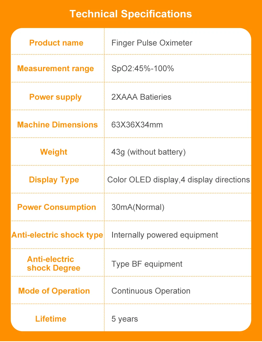 Диапазон измерения: SpO2: 45-100% Частота пульса: 25BPM-250BPM