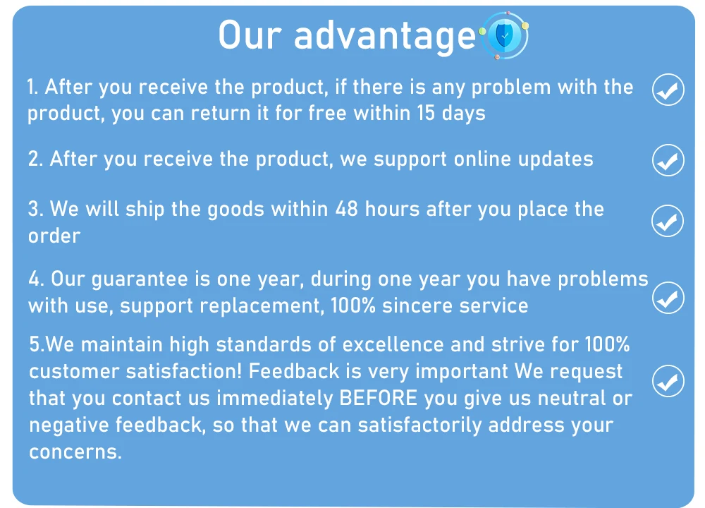1. 12 месяцев ограниченной гарантии производителя на дефектные изделия (за исключением предметов, поврежденных или неправильно использованных после получения). Аксессуары поставляются с гарантией на один год. 2. Дефектные предметы должны быть зарегистрированы и возвращены в течение гарантийного срока (и в оригинальной упаковке, если это возможно). Вы должны описать дефект и предоставить номер вашего заказа. Мы не ремонтируем и не заменяем товары с истекшим сроком гарантии. Оставляя заказ на Aliexpress, вы соглашаетесь со всеми приведенными выше правилами!