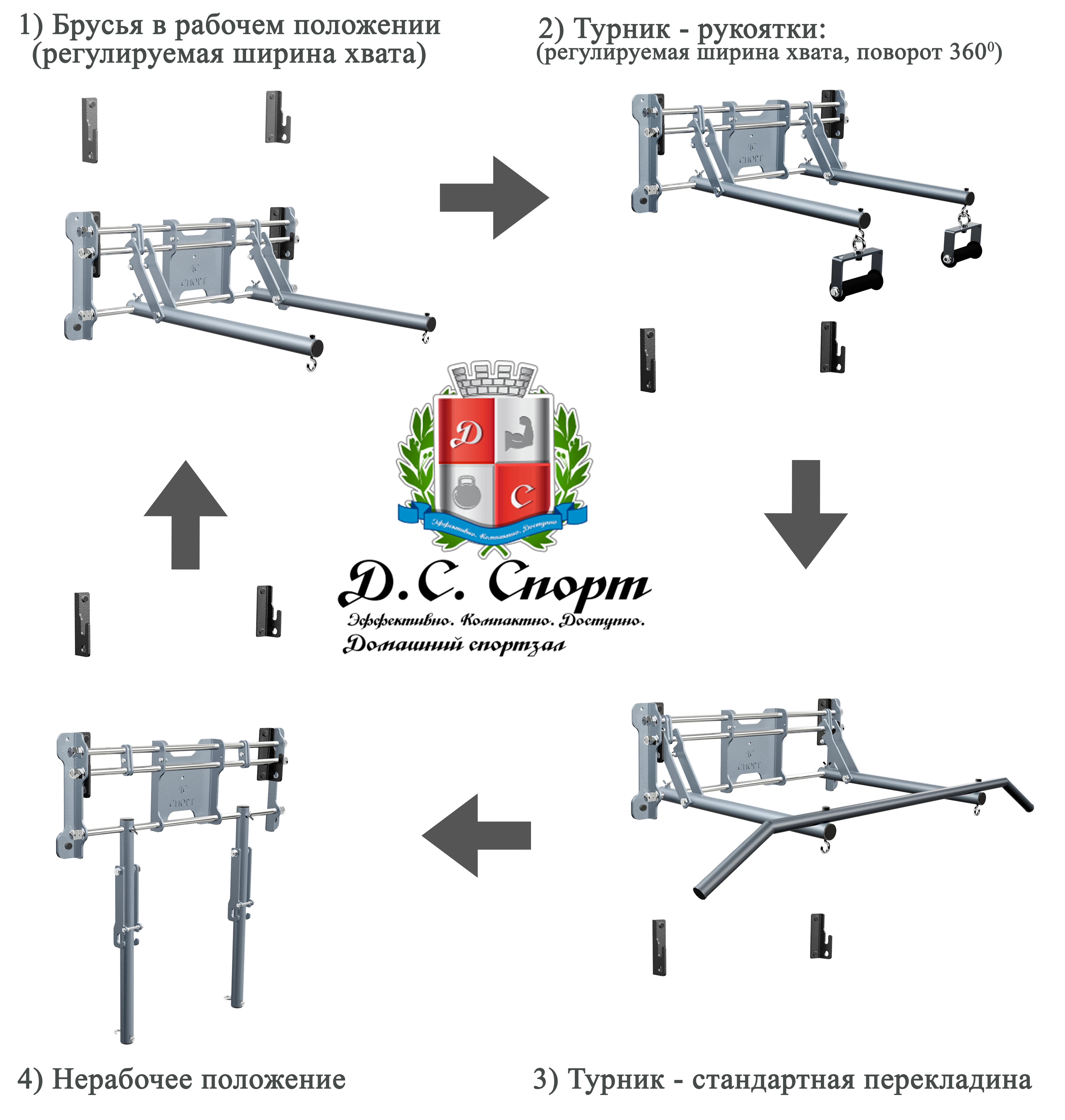 4) Переставляются из положения брусьев в положение турника и наоборот за несколько секунд.