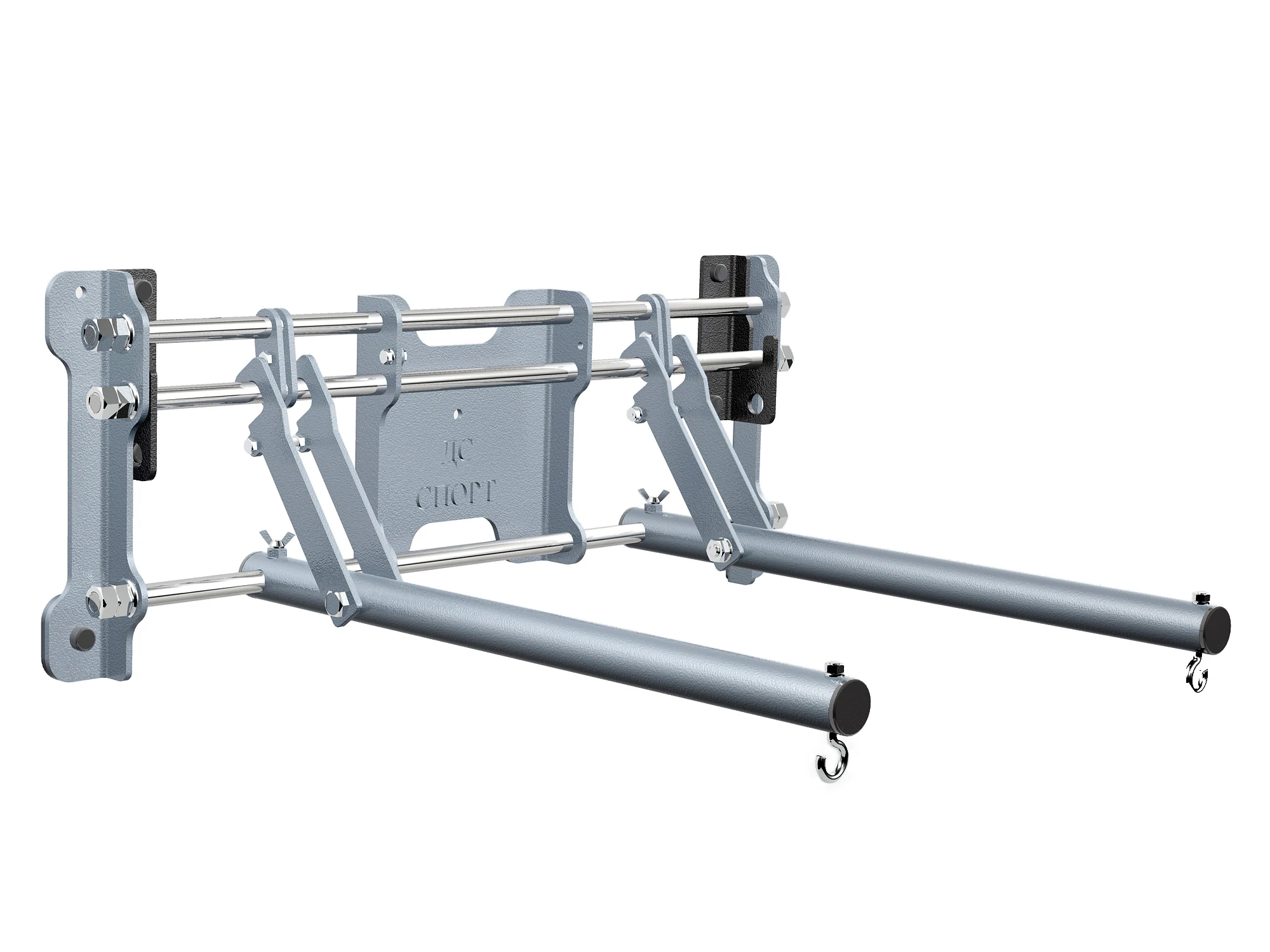Регулируемый параллельный хват.Для этого необходимо установить брусья на верхние кронштейны, снять прекладину и ухватиться за штанги брусьев (которые регулируются по ширине). Ширину хвата можно регулировать передвигая штанги вдоль центрального вала.