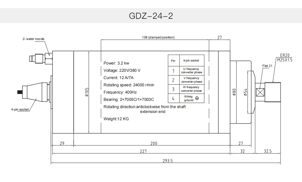 3. Охлаждение: водяное охлаждение 4. Интерфейс питания: дополнительный H17-4 штифтов Водонепроницаемая воздушная вилка. К инвертору (U, V,) была подключена воздушная вилка с маркировкой «1», «2», «3», «4», «1», «2», «3», W),