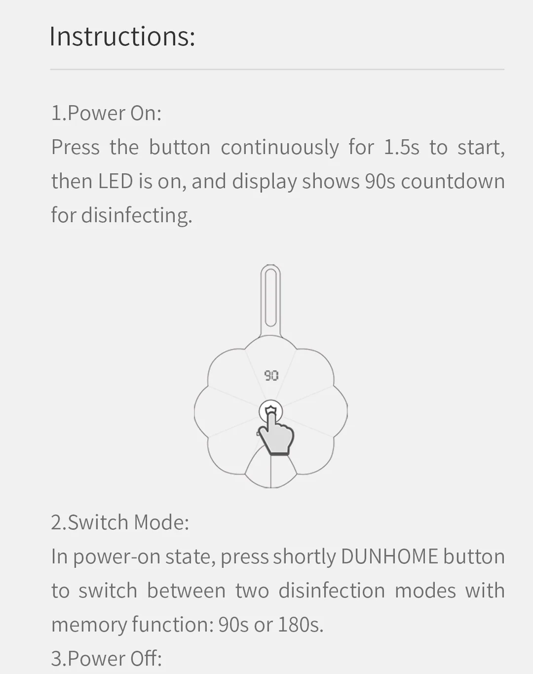 2. Переключение режима: в режиме включения питания, короткое нажатие клавиши дезинфекции для переключения между двумя режимами дезинфекции 90 секунд/180 секунд, и предпочтения пользователя могут быть Запомните.