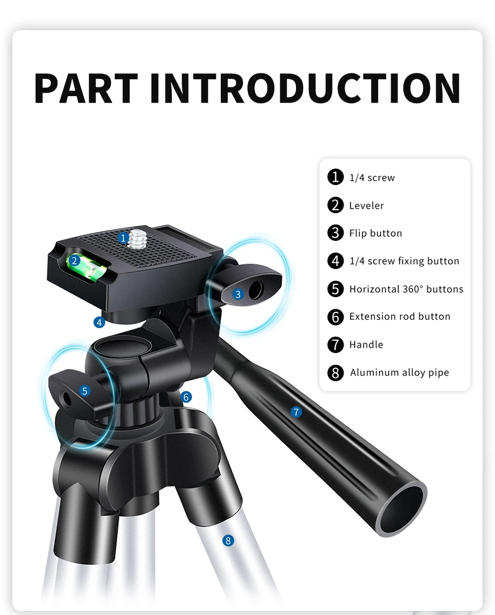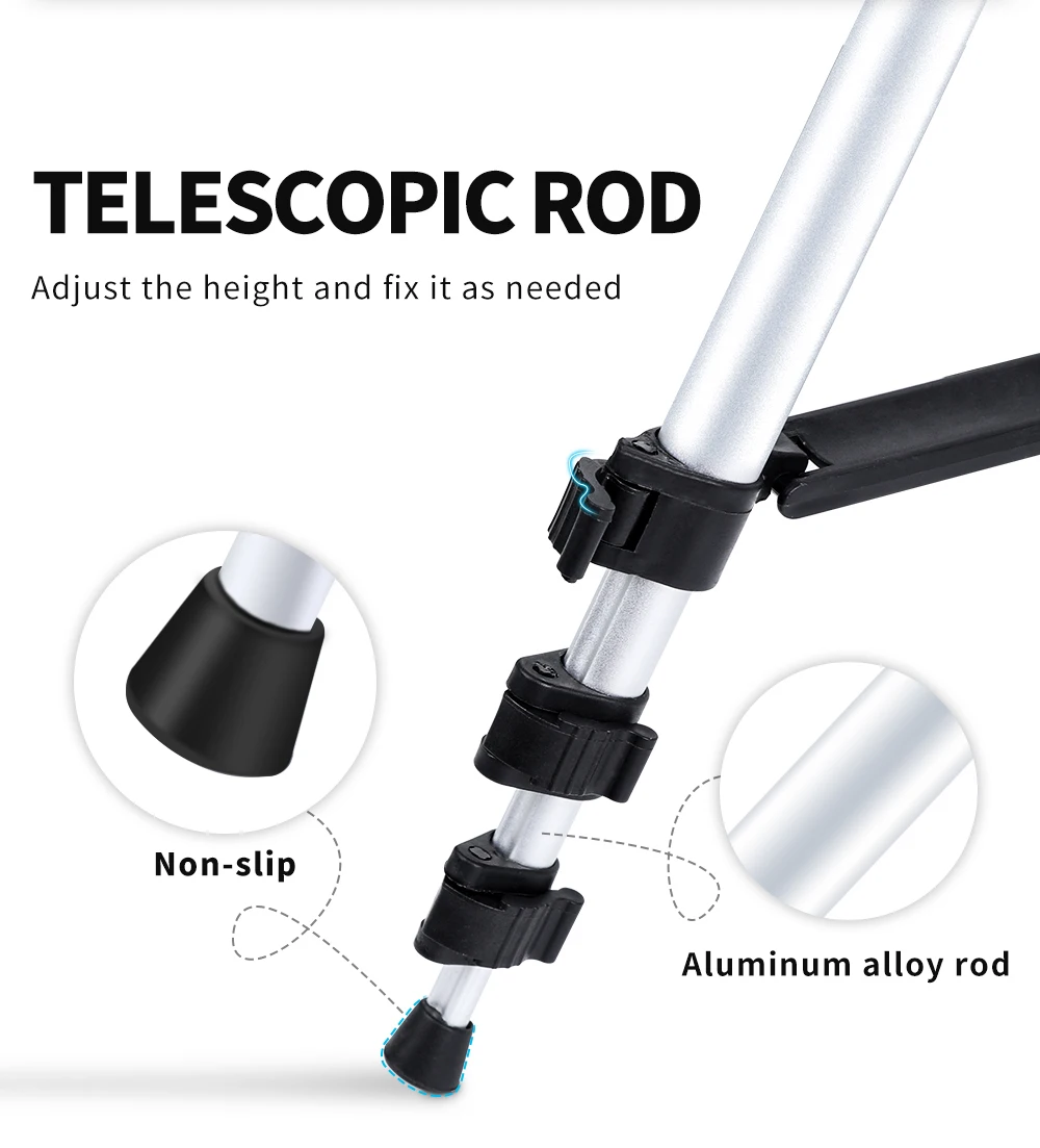 1. Портативный и гибкий, идеально подходит для наружных, дорожных и таймеров 2. Встроенный пузырьковый уровень, что делает ваш штатив идеально выровненным 3. Совместим со всеми видами цифровых камер, видеокамеры или смарт-фона. 4,360 ° по горизонтали и 90 ° по вертикали для удовлетворения различных потребностей 5. С рукояткой для регулировки положения головки 6. Алюминиевые ножки с нескользящей резиновой подошвой, больше безопасности.