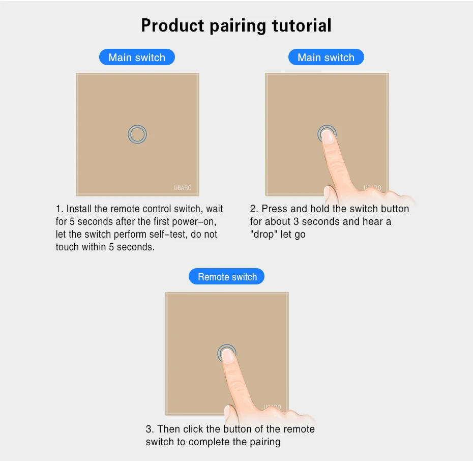 1. Название бренда: UBARO 2. Кнопка: 1 банда, 2 банды, 3 банды на выбор 3. Цвет: черный, белый, золотой 4. Размер: 8,6*8,6*3,5 см/3,4*3,4*1,4 "(Д * Ш * В) 5. Ток: 10A 6. Ватт: 3-300 Вт/комплект 7. Рабочее напряжение: 100-240 В переменного тока 8. Рабочая температура: -20 ℃ ~ + 70 ℃ 9. Относительная влажность: 10% ~ 90% 10. Механический срок службы: 100000 раз 11. Сертификация: CE,CCC ,ROHS 12. Гарантия: 1 год 13. Время доставки: <3 дня получили ваш заказ 14. Вес брутто: 0,28 кг 15. Размеры посылка: 9,0*9.0x4.0 см/3,5x3,5x1,55 (Д * Ш * В)