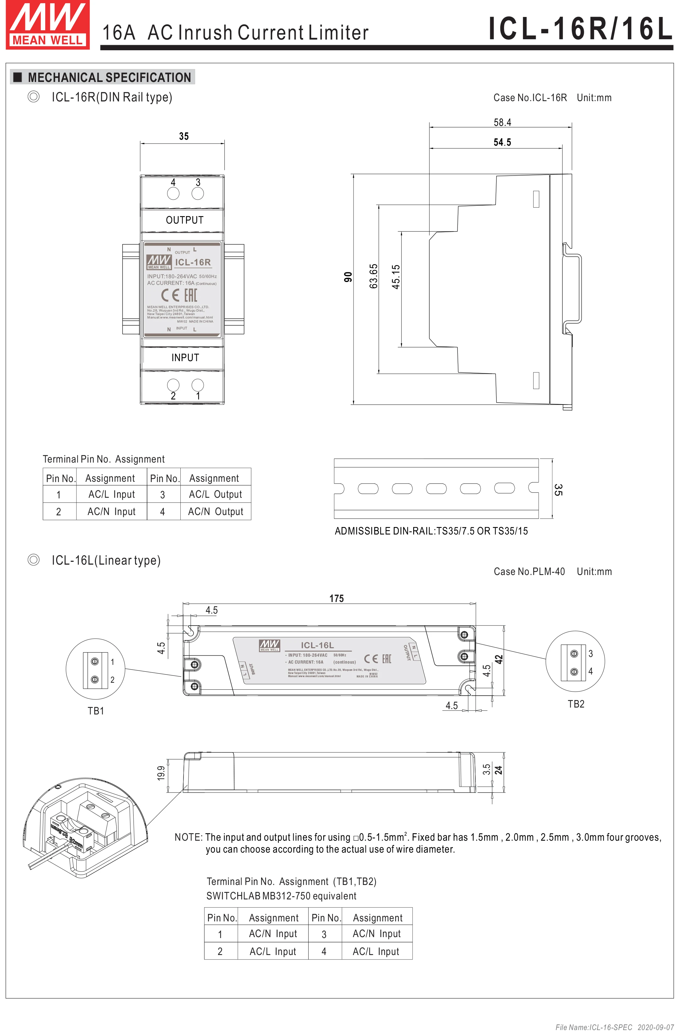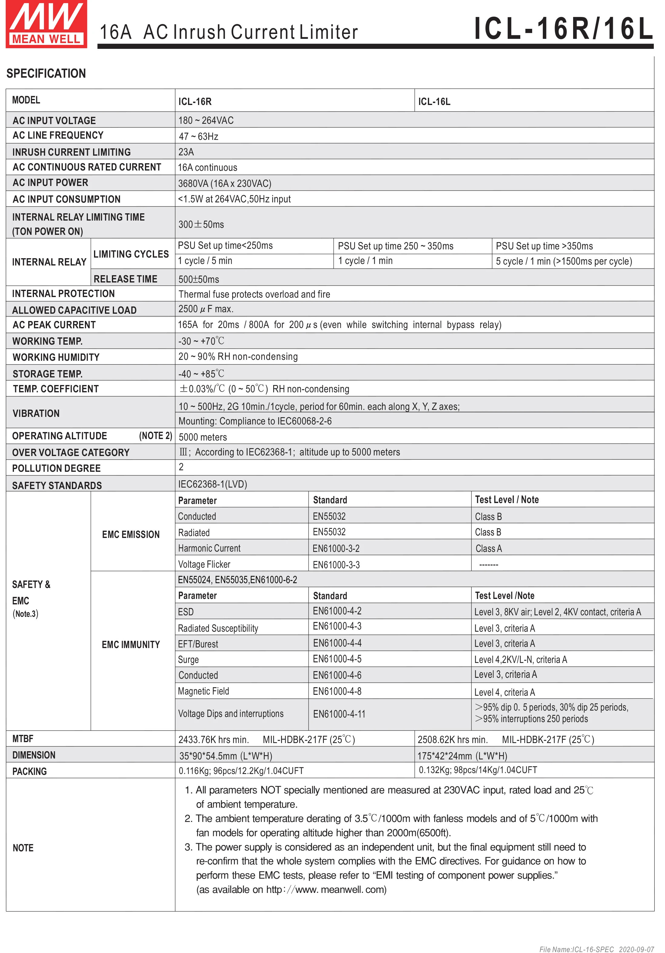 . 23A ограничительный ток, 16A непрерывный · 180 ~ 264VACAC вход · Lntegrated bypass реле, нет простого NTC · Lnternal термальная защита · Установлен на din-рейку TS-35/7,5 или 15 (ICL-16R) ·-30 ~ + 70 °C Широкая рабочая температура · 3 года гарантии