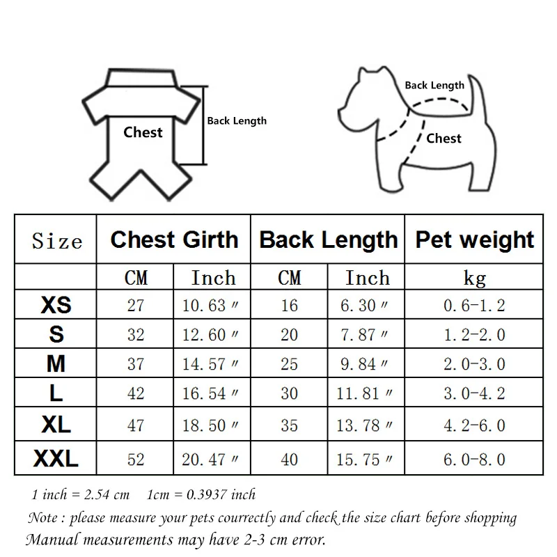 1. Ручные измерения могут иметь погрешность в 2-3 см. 2. Для двух ног, пожалуйста, обратите внимание на обхват груди, и для четырех ног, должны соответствовать обхвату груди и длине спины. 3. Для растущего питомца лучше выбрать больший размер.