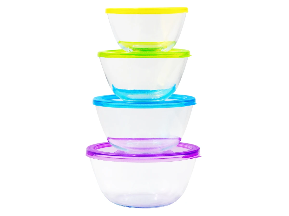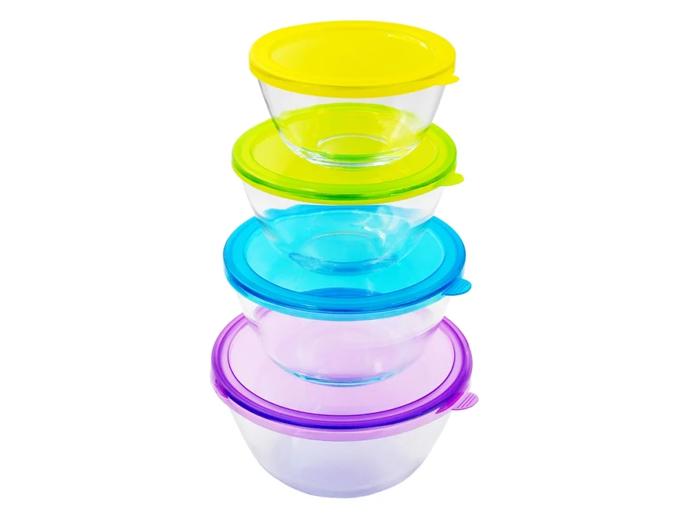 Набор мисок для хранения и запекания с крышками "Eley" объемом 800 мл, 1000 мл, 1500 мл, 2000 мл, пищевые из жаропрочного боросиликатного стекла.