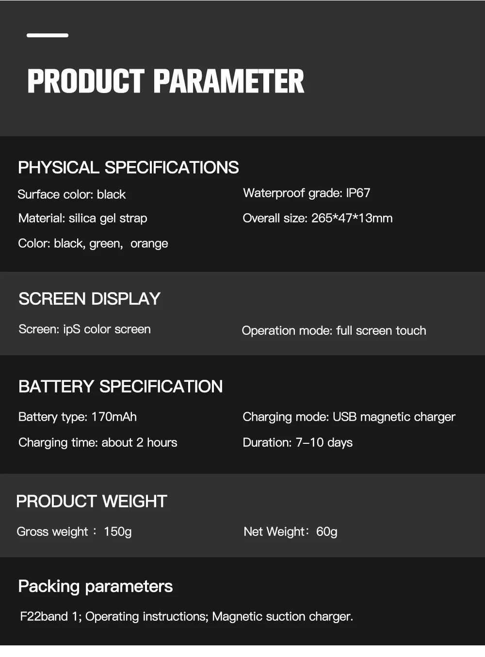Параметры: App OS:IOS9.0 и выше, Android4.4 и выше Основные функции: мониторинг сердечного ритма, артериального давления, кислорода в крови, шагов, расстояния, калорий, несколько режимов упражнений (бег, гольф, бейсбол, теннис, Велоспорт, плавание, Футбол, Баскетбол), мониторинг сна, оповещение о звонках (номер вызова/имя), оповещение о информации, прогноз погоды, оповещение о будильнике, напоминание о сидячем положении, Поднятый экран запястья, удаленная камера и т. Д. Сенсор: SC7A20 Процессор чип: HS6620D Датчик сердечного ритма: HRS3300 Вибрация: Да Водонепроницаемый: IP67 Смотреть supportlanguage: тайский, русский, английский, немецкий, испанский, французский, польский Поддерживаемые приложения: упрощенный китайский, традиционный китайский, датский, чешский, немецкий, итальянский, польский, тайский, шведский, финский, голландский, Португальский, английский, корейский, испанский, японский, французский, русский, арабский, украинский, болгарский, Bokemaerwen, Норвежский, хинди, индийский, итальянский, вьетнамский Размер: 1,54 "экран 240*240 dpi Bluetooth:BLE 4,0 Материал ремешка: Цвет: черный, зеленый, оранжевый Работа: Полный сенсорный экран Аккумулятор: литий-полимерный аккумулятор Ёмкость: 170 мА-ч Время работы в режиме ожидания: 7-10 дней Тип зарядки: USB Магнитный всасывающий зарядный провод Время зарядки: около 2 часов Название приложения: Dafit Посылка включает в себя: 1 * F22 Смарт-часы с rertail box 1 * кабель для зарядки 1 * Руководство пользователя Внимание: эти часы поддерживают gps-трекер, а не встроенные GPS. Для использования необходимо подключить bluetooth.