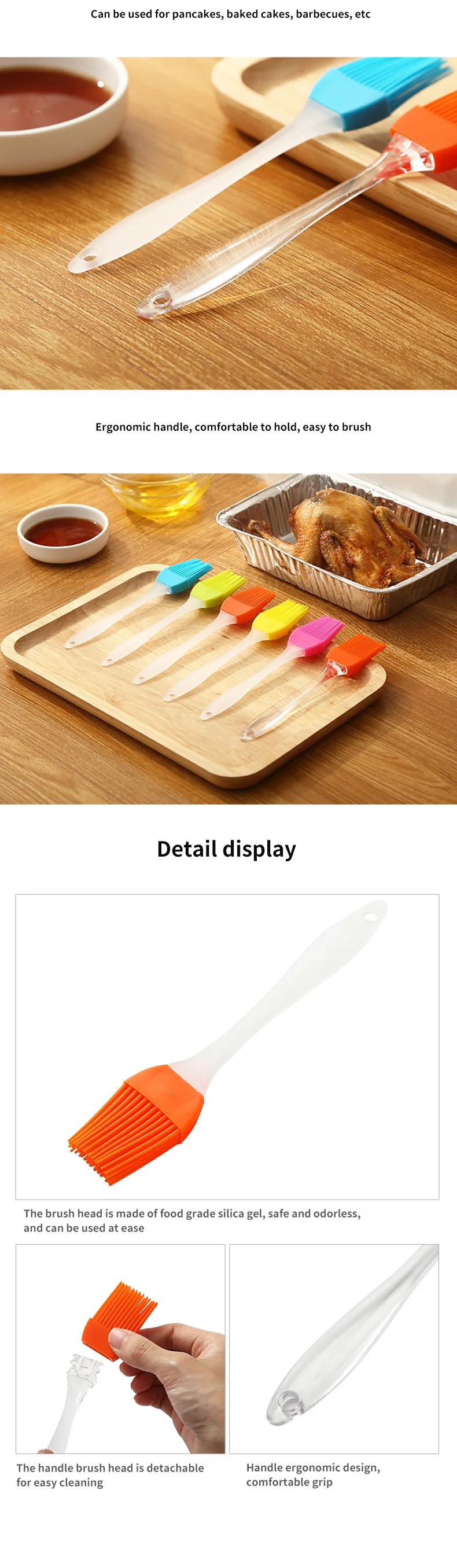 Название продукта: Многофункциональная щетка для барбекю (съемная) Материал: пищевой силикагель Размер: 16 см * 3 см * 3 см * 1 см Температура: - 40 °C ~ 230 °C Вес нетто: около 12 грамм Характеристики: Нескользящие, теплоизоляционные, износостойкие, съемные и легко чистятся Информация о продукте: 1. Задняя конструкция крюка и петли, легко разместить подвеску, сушка на воздухе, более удобное хранение, экономия времени, свободное пространство для кухни. 2. Головка кисти однородная и тонкая, без выпадения волос, съемная ручка, грязная и легко моется. 3. Конструкция стеклянной ручки не только отвечает требованиям ручного прикосновения, но и обеспечивает чистый эффект. Примечание: Из-за небольшой электростатической адсорбции на поверхности силикагеля, он прилипает к небольшим частицам или пыли в воздухе. Не подвергать воздействию воздуха, когда не используется в течение длительного времени. Размеры Описывает размеры продукта, включая различные размеры SKUs.