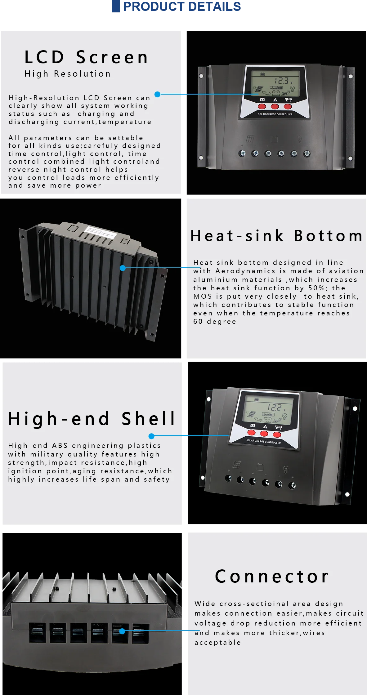 2. Защита: Защита от низкого напряжения, защита от перенапряжения, защита от перезаряда, защита от перегрузки, защита от перегрузки по току, защита от высоких температур, защита от короткого замыкания, защита от обратного разряда, защита от обратного хода солнечных панелей и батарей;