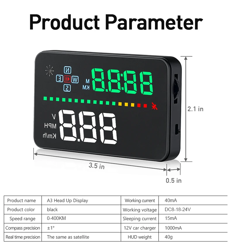 1. Доступен для любого автомобиля, прост в установке, подключи и работай 2. Экран 3,5 дюймов HD дисплей 3. Многоцветная конструкция делает экран более насыщенным и легче читать 4. Нано-технология для устранения двойных отражений, более четкая. 5. Богатое содержание: скорость, компас, одиночное время вождения и расстояние, местное время, номер спутника, высота, сигнализация скорости, свободный переключатель между км и милями 6. Автоматическое включение/выключение: HUD Пуск и выключение автомобиля, эффективная защита автомобильного аккумулятора; Сохранение режима ручного переключения, более легкое управление HUD. 7. Автоматический и ручной режим регулировки яркости, вождение без бликов.