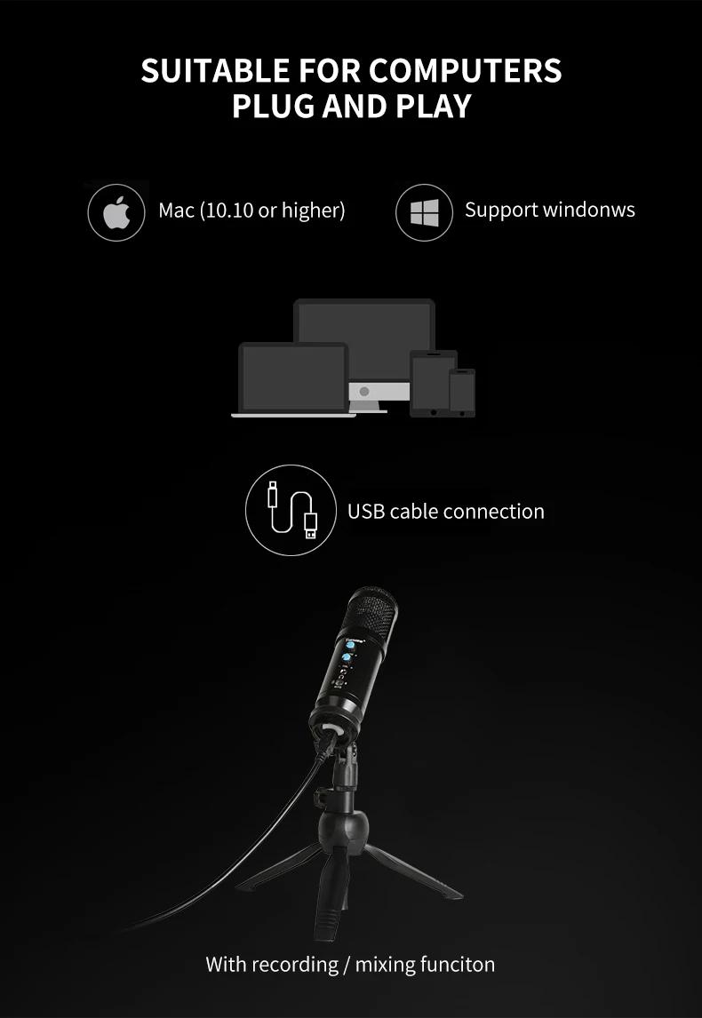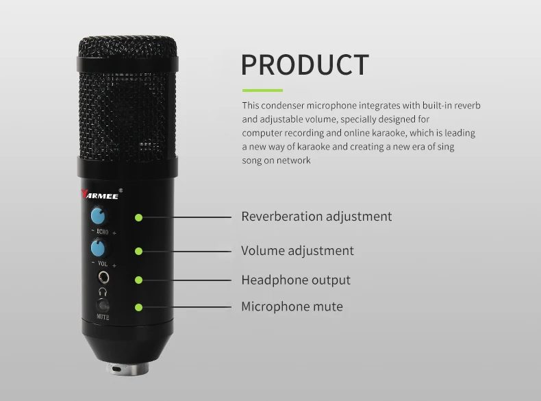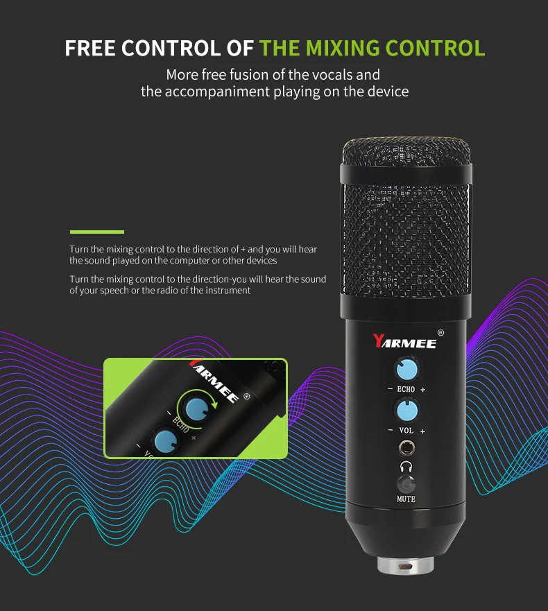 Технические характеристики: Бренд: YARMEE Цвет: черный Звуковая головка: емкостная Частота: отклик: 30 кГц-20 кГц Напряжение: кардиоид (0-180 @ 1 кГц> 12 дБ) Максимальный уровень звукового давления: 120 дБ s.pl Соотношение сигнал-шум: 70 дБ Чувствительность: 25 мВ/па (30 дб-34 дБ) Размер продукта: 160 мм * 47 мм Вес: 240 г Выходной разъем: USB-разъем Функция голосового усилителя: + 1 дБ-+ 25 дБ с регулируемым коэффициентом усиления Регулятор громкости: регулятор громкости наушников Особенности: 1. Со встроенным ревербератором нет необходимости в отдельной звуковой карте, чувствительной прозрачной и естественной. 2. Широко используется для пения видеозаписей игровых встреч в онлайн-классах. 3. Диафрагма из алюминиевого сплава, передача звука на уровне студии. 4. Встроенный усилитель для наушников с высокой мощностью. 5. Более свободное слияние вокала и сопровождение воспроизведения на устройстве. 6. Громкость гарнитуры можно регулировать, вращая громкость в передней части микрофона. Комплекпосылка ция: 1 x Микрофон 1 x насадка-губка для микрофона 1 штатив 1 x USB-кабель