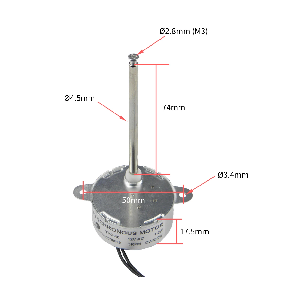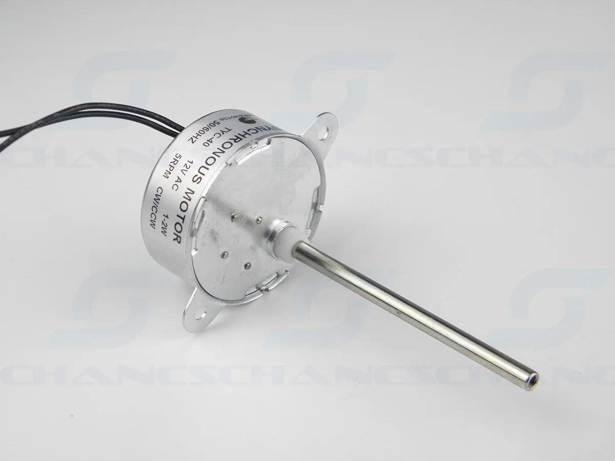 Название продукта: Синхронный двигатель; Напряжение: 12 В постоянного тока; Модель: TYC-40; Скорость: 5 об/мин; Диаметр вала: 4,5 мм; Длина вала: 74 мм; Внутренний Диаметр резьбового вала: М3, (Φ2.8мм); Диаметр монтажного отверстия: M4 (φ3.4мм); Направление: CW/CCW(UNCONTROLLAB); Крутящий момент: ≤ 0,5кг * см; Частота: 50/60 Гц;