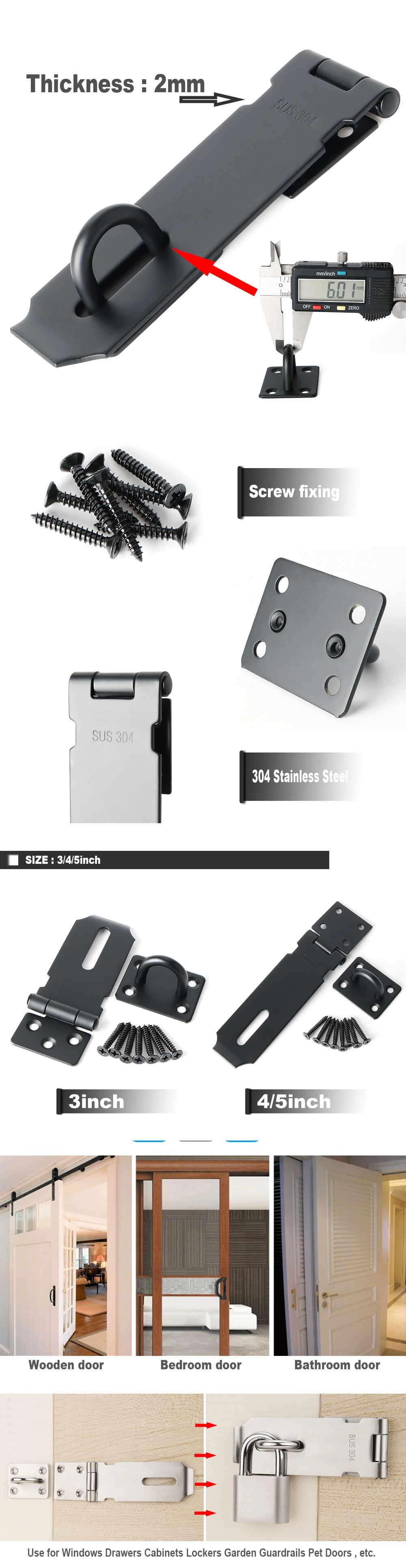 Технические характеристики -Материал: нержавеющая сталь SUS 304 -Толщина: 2 мм -Отделка: Матовый/матовый черный -Размер: 3 дюйма/4 дюйма/5 дюймов -Способ установки: фиксация винта Посылка включает в себя 1 х крючок 8 винтов Купить у Alise Прочная металлическая конструкция, 2 мм-толстый, сверхмощный дизайн; Высокое качество монтажные hardwares Многослойная матовая черная отделка, создающая черный и элегантный внешний вид, подходит для всех видов дверей и окон в доме Гарантия возврата в течение 30 дней