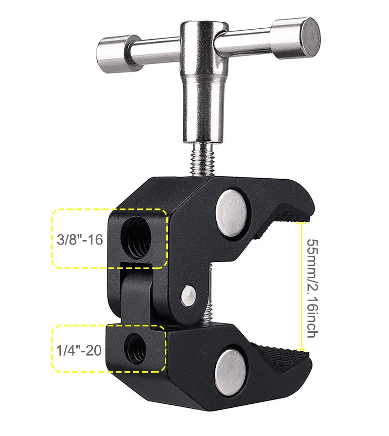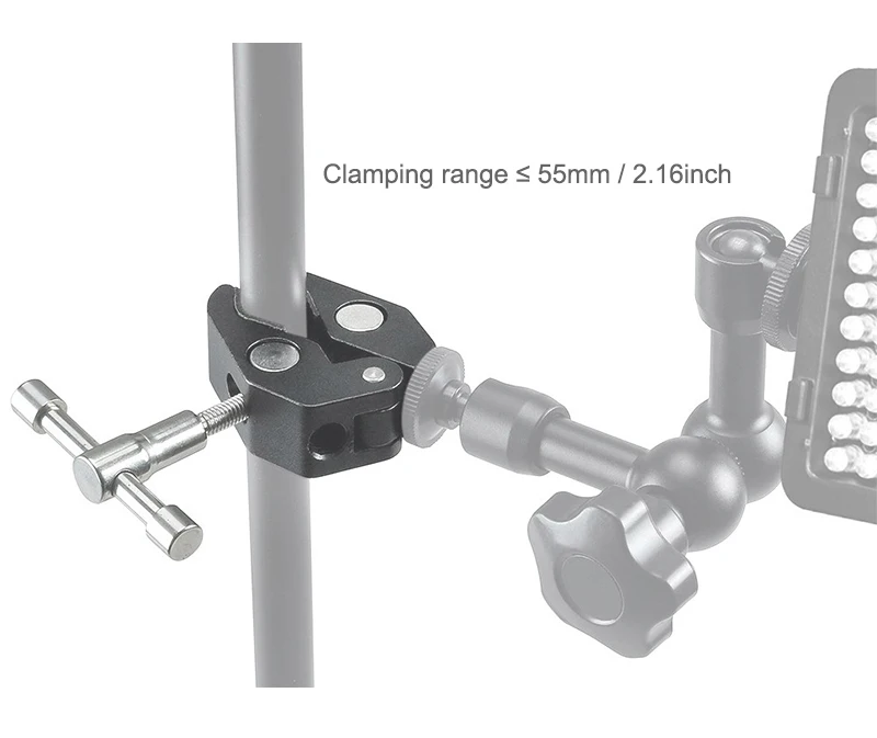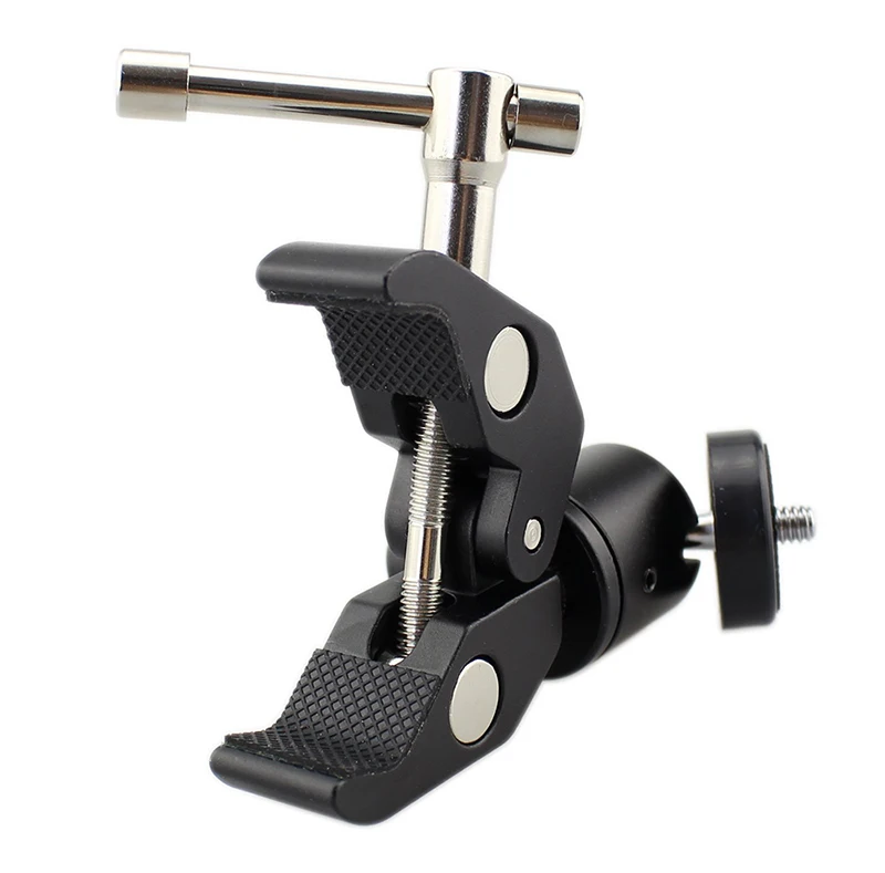 SUPER CLAMP-magic arm clamp имеет гнездо 1/4-20 и 3/8-16, оба стандартных размера фитинга в фотостудии для головок и штативов используется для различных насадок. Как камеры, 15 мм стержни, светодиодные фонари, зонты, крючки, полки, Пластины стекла, поперечные стержни и т. Д.
