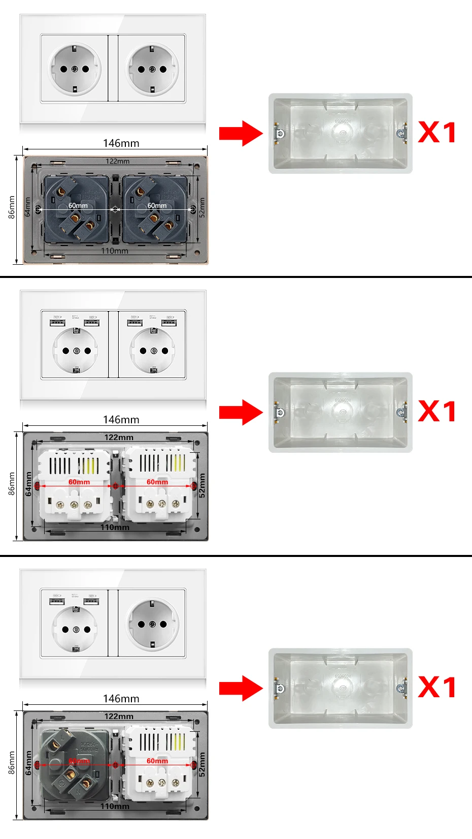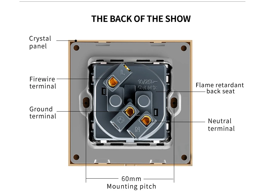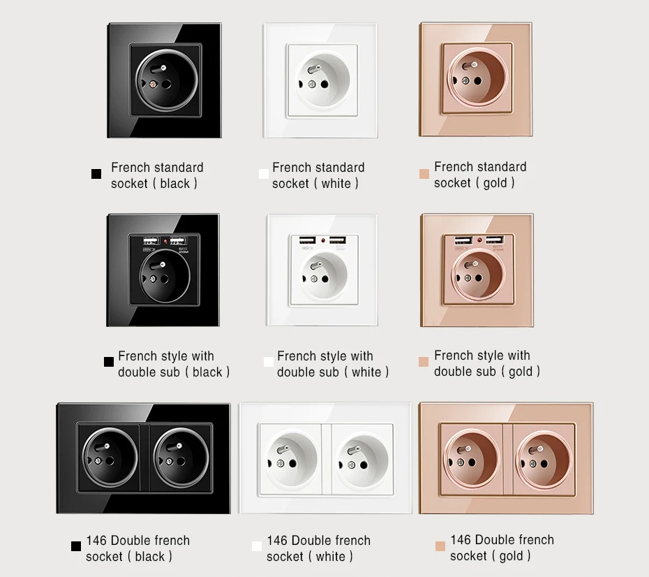 1. Настенная розетка используется для питания мобильных телефонов, цифровых продуктов и других электрических эквивалентов. 2. Этот продукт должен быть установлен профессиональным электриком. 3. Он широко используется во многих местах, таких как: отель, ресторан, дом, общественные места. 4. Материал: панель с гнездом из закаленного роскошного кристального стекла, водонепроницаемый, ПК огнеупорный чехол. 5. Цвет: белый/золотой/черный. 6. Квадратная Модель: 86. 7 、 Вход Напряжение: AC 110-250V 50/60Hz Максимальный ток: 16A. 8. Размер панели: 146x8 6 мм/5,74x3,39 дюйма 9. Упаковка в коробке: 1 шт. + 2 винта.