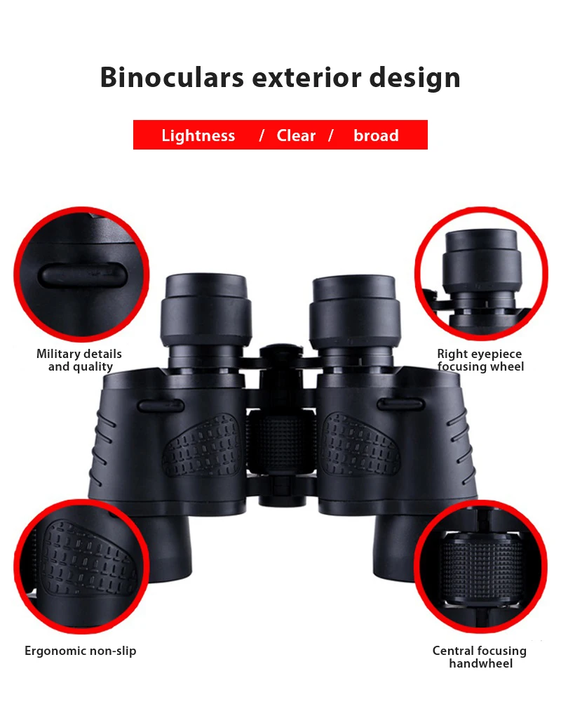Спецификация: 80X80 Увеличение: 8X Диаметр объектива: 36 мм Диаметр окуляра: 20 мм Диаметр выхода: 3,75 мм Расстояние выхода: 13,1 мм Внешний вид: Нескользящая Резина Покрытие: красная пленка Вес: около 670 г Режим фокусировки: Центральный фокус, коррекция правого глаза Аксессуары: Черная мягкая сумка, ремешок, зеркальная ткань, руководство пользователя на английском языке Использование продукта: просмотр, путешествия, спорт на открытом воздухе, просмотр игр, представлений, наблюдение за птицами, наблюдение за дикой природой, кемпинг, туризм, приключения, рыбалка, просмотр местности, наслаждаясь пейзажами и т. д.