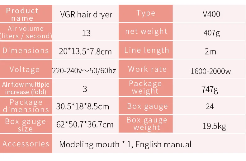 Описание: ◈ [Выбор высококачественного электродвигателя переменного тока]: высокая мощность обеспечивает высокоскоростной поток воздуха. Высококачественный двигатель переменного тока выбирается с высоким крутящим моментом, высокой скоростью и отличной производительностью. Для всех видов коротких и средних волос быстросохнущие волосы-это гибкая укладка, которая обеспечивает устойчивый и сильный источник ветра. ◈ [В зависимости от требуемой температуры, одноклавишный переключатель]: два варианта температуры, переключатель по желанию. Во время удовлетворения различных потребностей в уходе за волосами, операция проще и имеет функцию переключения между горячим и холодным. Innovative [инновационный дизайн нагревательного элемента, равномерное нагревание без повреждения волос]: знания о маленьком теле, дизайн традиционного нагревательного элемента фена для волос, высокая устойчивость к электрическому нагреванию сплава нагревательной проволоки, инновационный слой с номером, плотно обмотанный, и сильное распределение теплового баланса. Воздух циркулирует, волосы не боятся повреждений, и каждый волос ждет мягко. Спецификация: Бренд: VGR Модель: V-400 Складная ручка: не Складная Шестерня управления скоростью: вторая шестерня Стиль Tuyere: одноколлекционное сопло Функция: постоянная температура Защита от перегрева: с Двигатель: двигатель переменного тока Нагревательная катушка: рифленая Номинальное напряжение: 220-240 В Номинальная мощность: 1600-2000 Вт Мощность: 50-60 Гц Длина кабеля: 2 м Размер корпуса: 20*13,5*7,8 см Посылка: 1x фен для волос 1 насадка для моделирования Советы: * Только вышеуказанная посылка, другие продукты не включены. * Примечание: светильник съемки и расхождений в настройках экрана может привести к тому, что цвет товара на картинку, чтобы быть s светильник ly отличается от реального товара. Допустимая погрешность измерения составляет +/- 1-3 см.