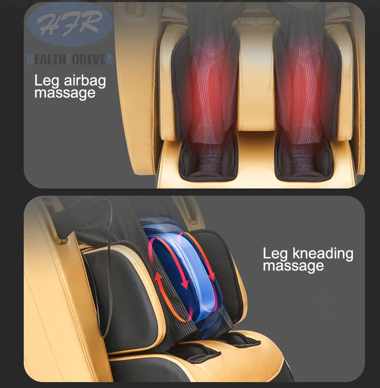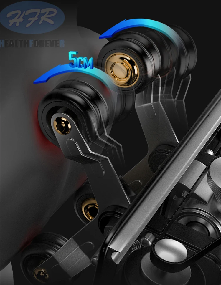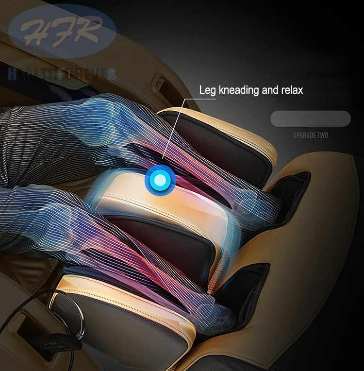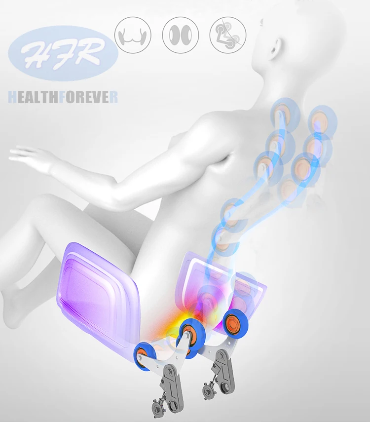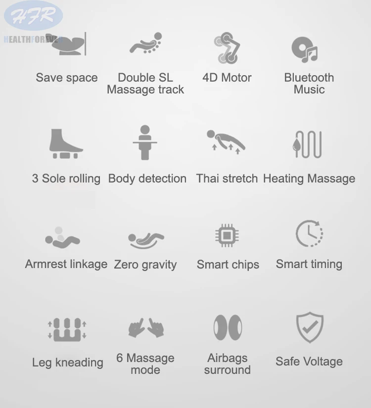 1.S-L тип кривой для массажа суставов человеческого тела; 2. Спинка С четырехколесным массажным механизмом; 3. Выдвижная подставка для ног максимум 20 см; 4. Весь стул с 6 двигателями водителя, 1 воздушный насос, 8 магнитных клапанов, 26 подушек безопасности; 5. Давление подушки безопасности для головы, плеч, ягодиц, рук, икр и ног; 6. Нагревание для талии и ягодиц; 7. Функция автоматического определения высоты; 8. Роликовый массаж для подошвы (разработан с 6 роликами); 9. Пульт дистанционного управления с tft-экраном; 10. Функции воспроизведения музыки по Bluetooth; 11. Функция нулевой гравитации, параллельная функция перемещения одной кнопкой.