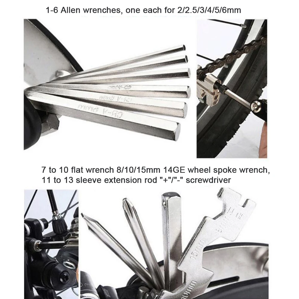 Функция одного ножа, включая шестигранный ключ 2/2.5/3/4/5/6 мм каждый, плоский гаечный ключ 8/10/15/14GE спицевой ключ, удлинитель рукава "+"/"-" отвертка.