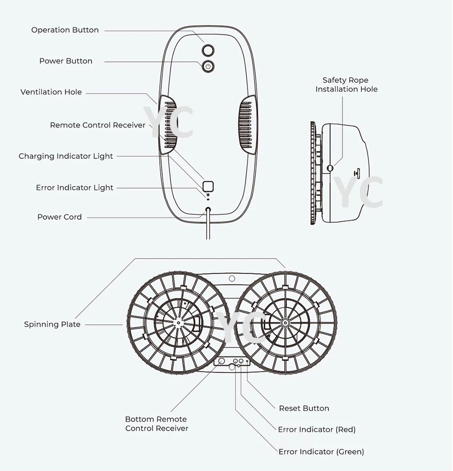 Застежки чистящего кольца и поворотного стола в нижней части фюзеляжа снабжены быстрыми наклейками для выравнивания. Нажмите на застежках после выравнивания в соответствии с быстрыми наклейками и убедитесь, что чистящий диск и нижняя часть фюзеляжа полностью горизонтальны со всех углов, что означает, что они установлены на месте. Если застежка плотно прилегает во время процесса, пожалуйста, будьте уверены, чтобы собрать. Нижний поворотный стол изготовлен из композитных материалов для уплотнения и прочности, с отличной эластичностью и прочностью.