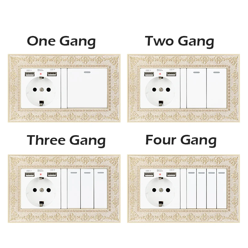 UNKAS 4D Zinc Alloy Metal Panel EU Socket Dual USB Port + 1 2 3 4 Gang 1 / 2 Way On / Off Light Switch Embossing Retro Frame
