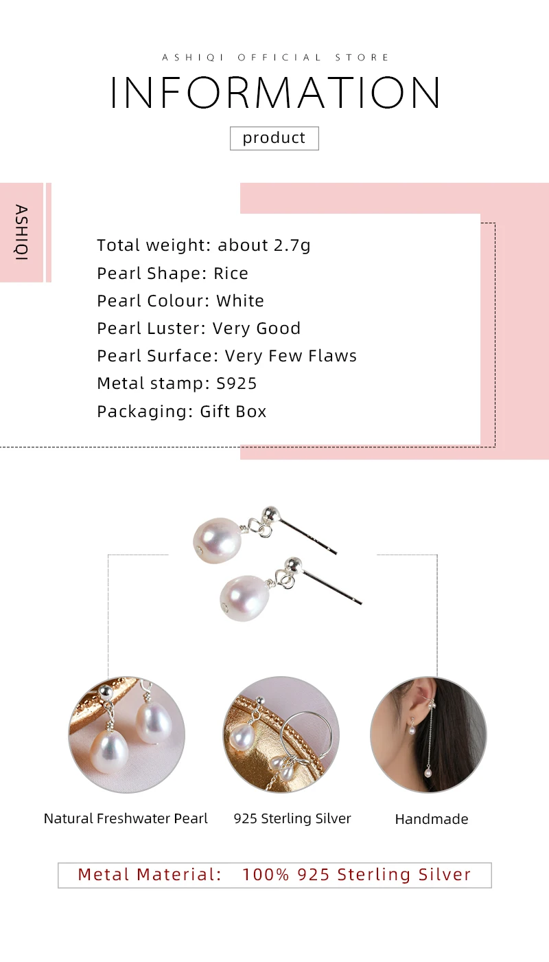 Бренд: ASHIQI Тип камня: натуральный пресноводный жемчуг Общий вес: около 2,7 г Жемчуг Форма: риса Жемчуг Цвет: белый Жемчужный Блеск: очень хорошо Поверхность жемчуга: очень несколько недостатков Металлический штамп: S925 Размер жемчуга: 3-4 мм/7-8 мм Материал металла: 100% 925 пробы Серебряный Упаковка: Подарочная коробка