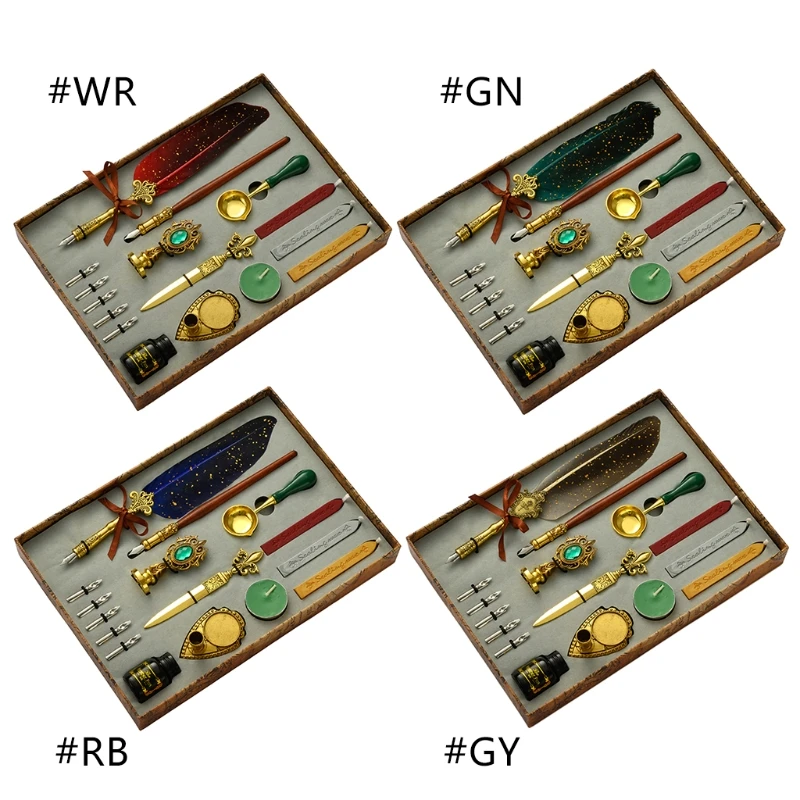 Набор перьев в стиле ретро. Посылка включает в себя 2 шт. Dip ручки стержни; 3 шт. воск уплотнения палки; 1 x медная ложка 1 x держатель пера; 1x10 мл бутылки чернил; 1 x маркер печать; 5 шт. перо; 1 штопор; 1 свеча. Отлично подходит для делового подарка, подарка на день рождения, подарка на годовщину.