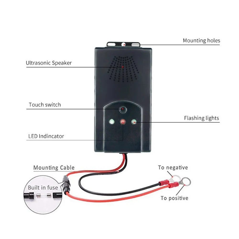 Отпугиватель вредителей транспортного средства: излучает сочетание ультразвуковых и светодиодный фонарей, чтобы отпугивать надоедливых животных в вашем автомобиле.