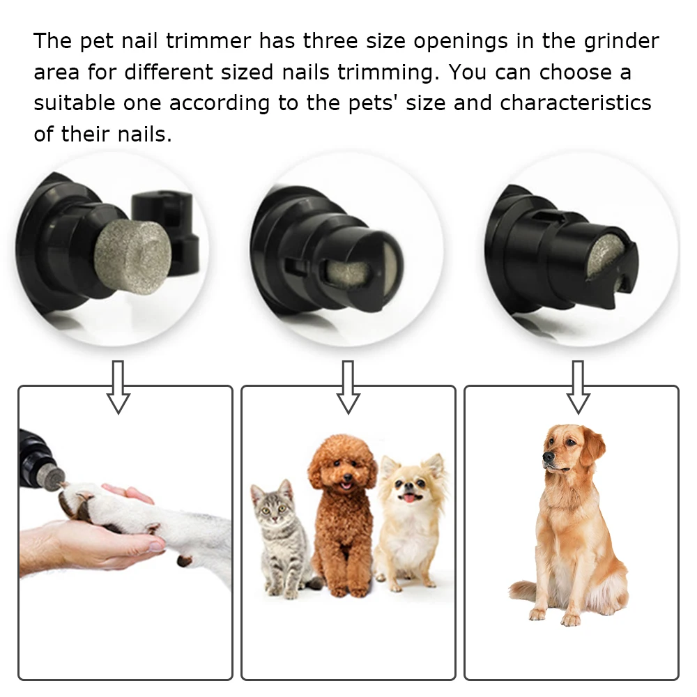 Триммер для ногтей для домашних животных имеет три отверстия в области шлифовальной машины для обрезки ногтей разных размеров. Вы можете выбрать подходящий размер в соответствии с размерами и характеристиками ногтей.