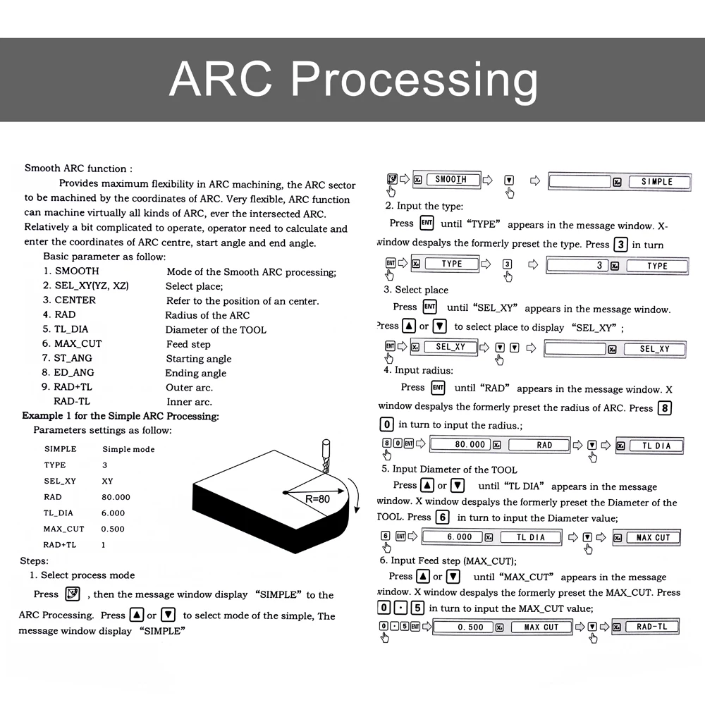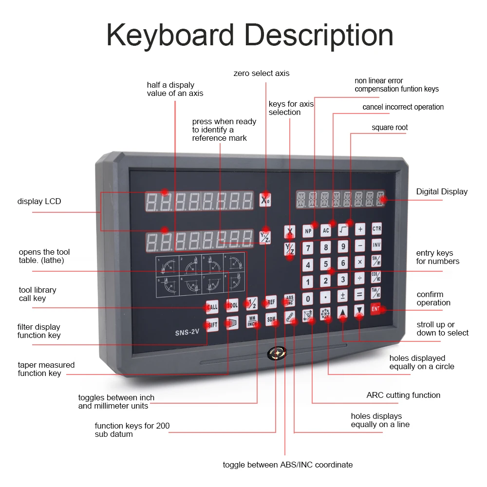 Описание клавиатуры:Ключи для выбора оси, нулевой выбор оси, ввод +/-знак, ввод десятичной точки, входные ключи для чисел, ключ операции (в клавише функции расчета), ввод или завершение вычисления, отмена неправильной работы, рассчитать обратный тригонометрический, квадратный корень, подтвердить работу, переключение между дюймами и миллиметрами, Нажмите, когда готовы определить контрольный знак, функциональные клавиши для 200 подданных, функция дуговой резки, отверстия отображаются поровну на круге, отверстия отображаются поровну на линии, вычислить тригонометрический или уклон обработки функциональная клавиша, рассчитать тригонометрические или прямоугольные внутренняя камера обработки функциональная клавиша, Рассчитать тригонометрическую или функцию компенсации диаметра инструмента, переключиться между ABS и I NC координат, прогуляться вверх или вниз, чтобы выбрать, коническая измеренная функциональная клавиша, инструмент библиотеки вызова, открывает таблицу инструментов. (Токарный станок), функциональная клавиша EDM, функциональная клавиша фильтра, половина значения дисплея оси, Функция компенсации нелинейных ошибок.