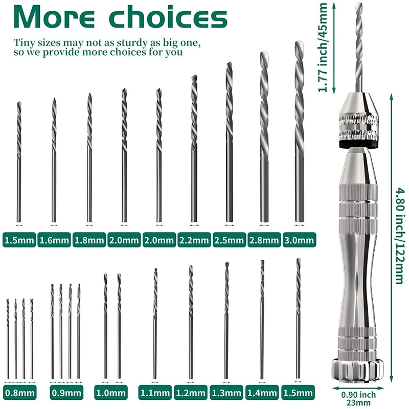 Но это не идеально подходит для твердого материала, как железо, сталь, камень и так далее. Хорошо подходит для создания проектов DIY, таких как ожерелье, серьги, ювелирные изделия, браслет, подвеска, брелок, модель, скульптура, кукла и т. д. 24 шт. сверла включают 15 различных размеров: 0,8 мм х4, 0,9 мм х4, 1,0 mmx2, 1,1 mmx1, 1,2 mmx1, 1,3 mmx1, 1,4 mmx1, 1,5 mmx2, 1,6 mmx1, 1,8 mmx1, 2,0 mmx2, 2,2 mmx1, 2,5 mmx1, 2,8 mmx1, 3,0 mmx1. Устойчивая к коррозии, прочная и долговечная.
