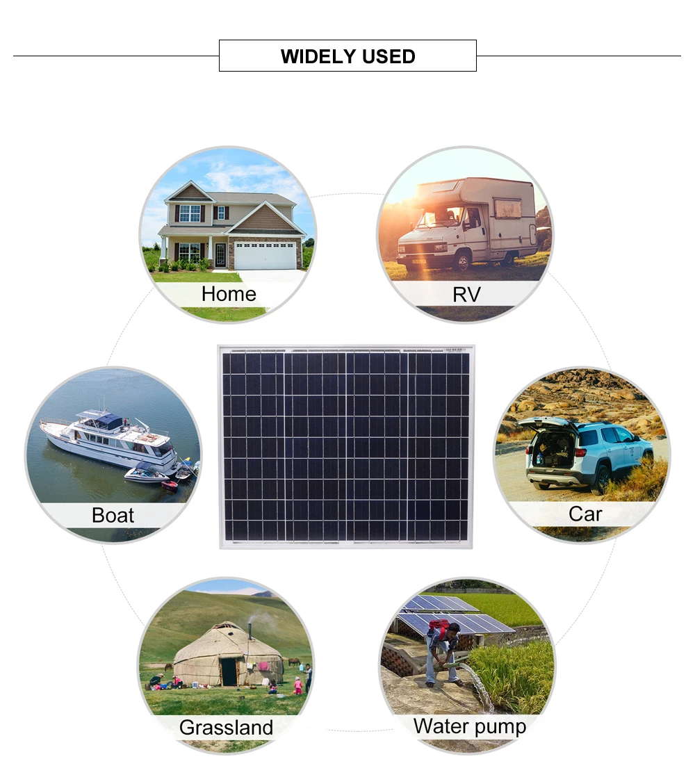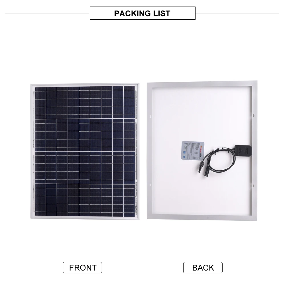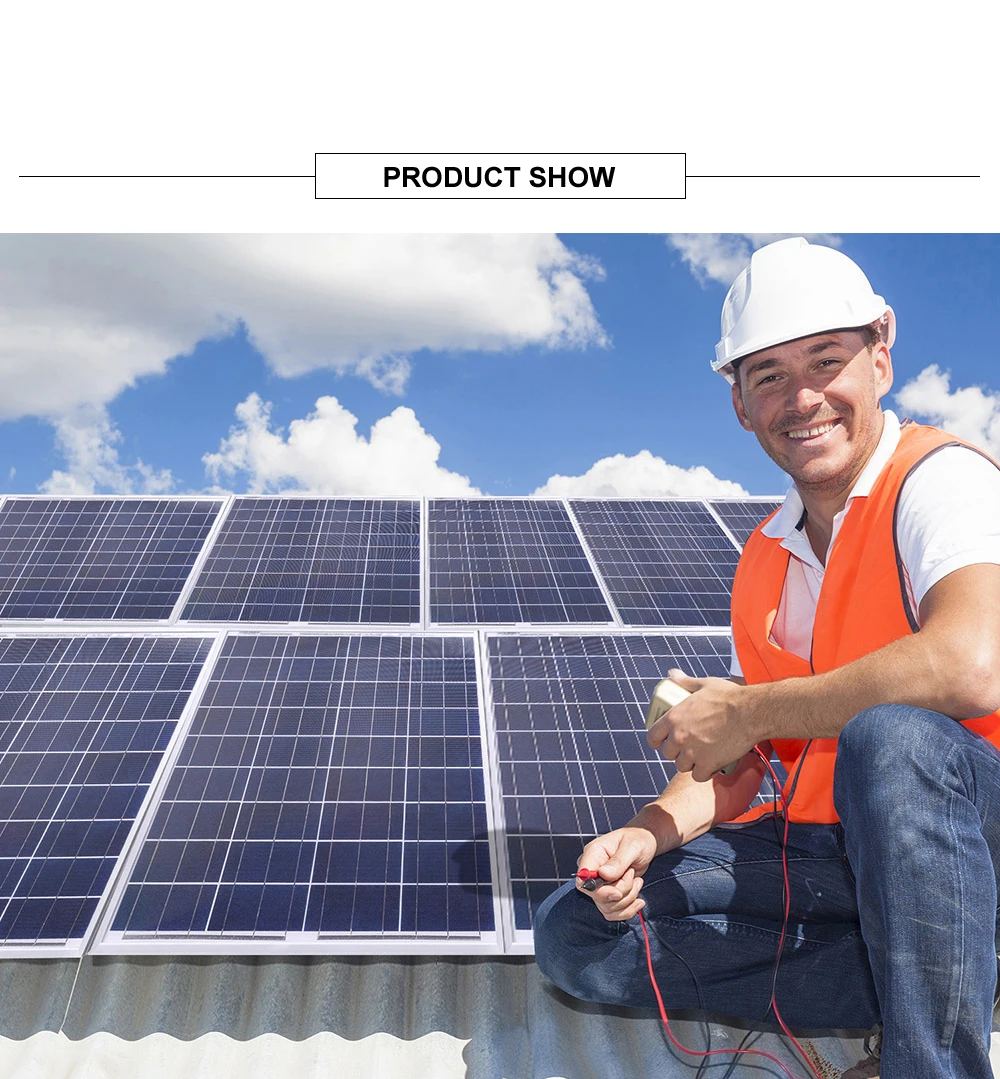 Характеристика: 1. Непромокаемые, водонепроницаемые. Изготовлен из закаленного стекла и алюминиевой рамы, прочный и долговечный. Срок службы более 25 лет. 2. Он имеет очень высокую стоимость. Мы специализируемся на производстве панелей солнечных батарей производители, имеют более чем для детей 10 лет опыта продукции и обслуживания клиентов, хорошую репутацию и широкий спектр группы покупателей. 3.R & D команда с основными технологиями, международной сертификацией, принимает массовую настройку, обработку! Все продукты сертифицированы по ISO, IEC, CE, TUV Модель: DSP-50P Максимальная мощность (Pmax): 50 Вт Материал: поликристаллический Максимальное напряжение питания (Vmp): 18,00 в Максимальный ток питания (Imp):2.78A Напряжение открытого замыкания (Voc): 22,50 в Ток короткого замыкания (Isc):3.03A Максимальное напряжение системы: DC1000V Максимальная серия предохранителей: 15а Номинальная рабочая температура ячейки.(NOCT): от-45 до 80 ℃ Вес: 4,1 кг Размеры: 530*660*25 мм Посылка: 50 Вт солнечная панель * 1 10а ШИМ контроллер * 1 (Приведенные выше данные основаны на лабораторной стандартной испытательной среде) Для полевых соединений Используйте minimun No.12AWG медные провода изолированные для минимального 90 ℃ Стандартные условия испытаний: AM = 1,5 излучения = 1000W/m2 Temp.= 25 ℃ (Размер измеряется вручную, и есть определенная погрешность.) Примечание: вам необходимо приобрести MC4 кабель между солнечные панели и контроллер. Контроллер поддерживает 12V свинцово-кислотная, литий-ионных и LiFePO4 батарейки. Контроллер не может использоваться для тестирования солнечных панелей. При достаточном количестве условий на светильник следует использовать мультиметр для испытания без нагрузки. Требуется подключение батареи