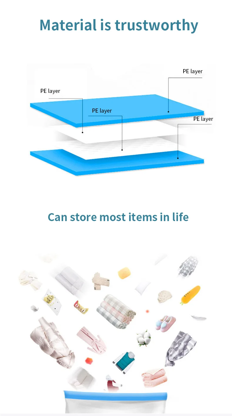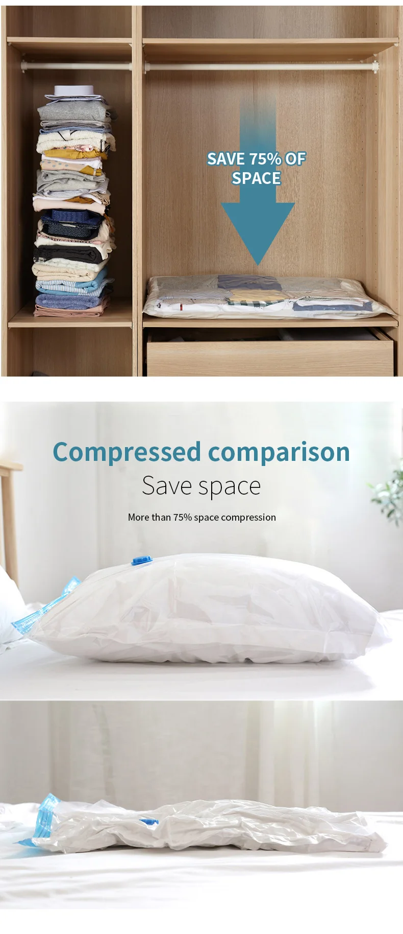 Вакуумный пакет, сумка для хранения, Домашний Органайзер, прозрачный складной органайзер с краями для одежды, сжатый герметичный пакет для путешествий Характеристика: Высококачественный плотный материал PA и PE, который нелегко сломать. Этот герметичный пакет для хранения идеально подойдет для хранения и поможет вам сэкономить до 75% места. С помощью этих сумок для хранения вы сможете сжимать сезонную одежду, подушки, бросить и постельное белье. Их можно укладывать друг на друга, можно сэкономить драгоценное пространство в шкафах, чердаке, гараже или подвале. Они также могут помочь защитить вашу одежду от воды, влаги, насекомых, моли, грязи, плесени и запахов. Когда меняется сезон, вакуумный пакет является хорошим инструментом для хранения тяжелой одежды, он больше не будет занимать ваш шкаф Примечание: фактически Размер, измеренный вручную, может иметь некоторые ошибки, он находится в диапазоне ± 1 см, пожалуйста, все преимущества в том же образе. Внимание: Ручные рулонные мешки и ручной насос случайного цвета. Посмотрите на комментарий перед покупкой товара! Характеристики: Материал: ПА + ПЭ Цвет: случайный цвет Количество: 1 шт. Вес (прибл.): 100 г Размер: как на изображении Продукция включает в себя: Сумка для хранения