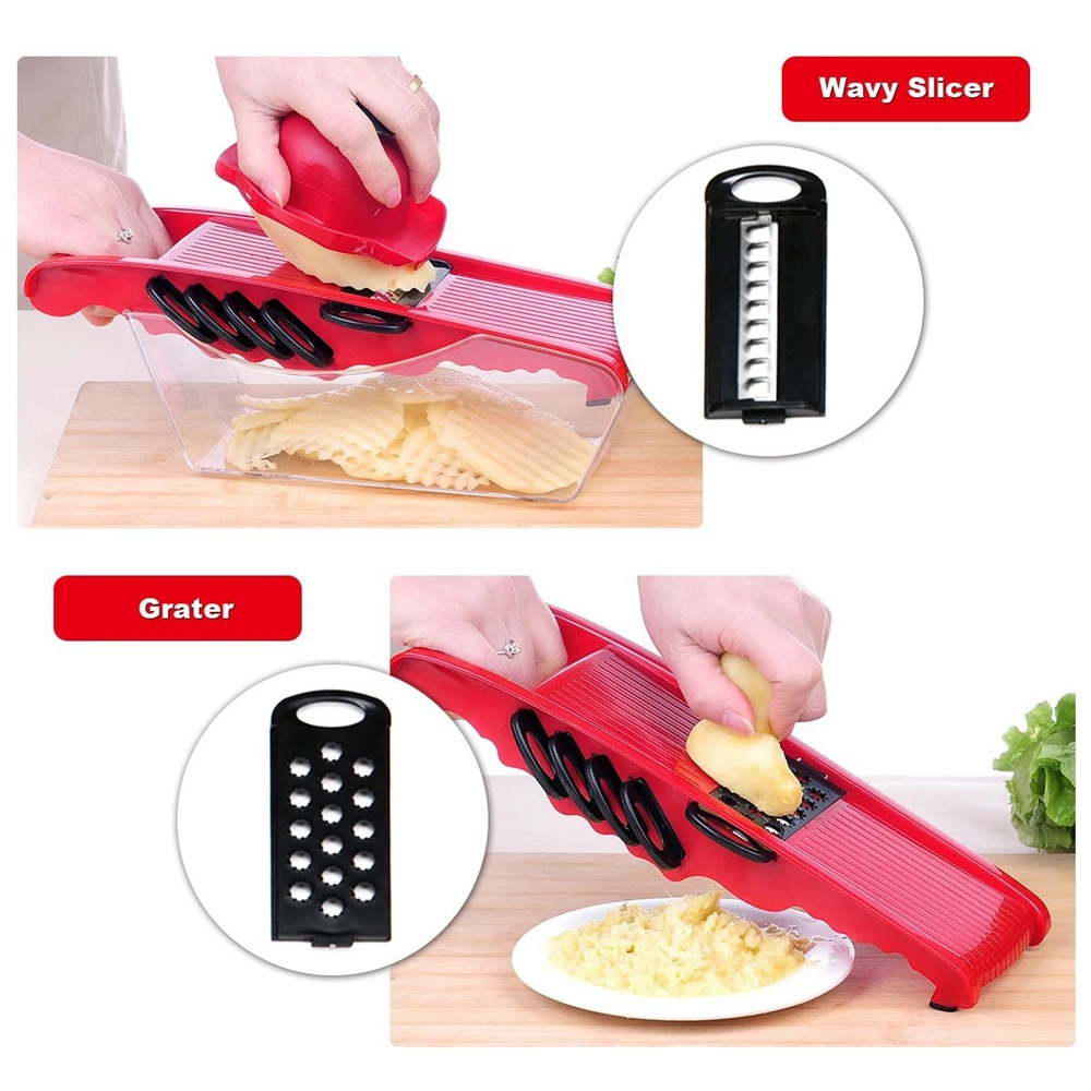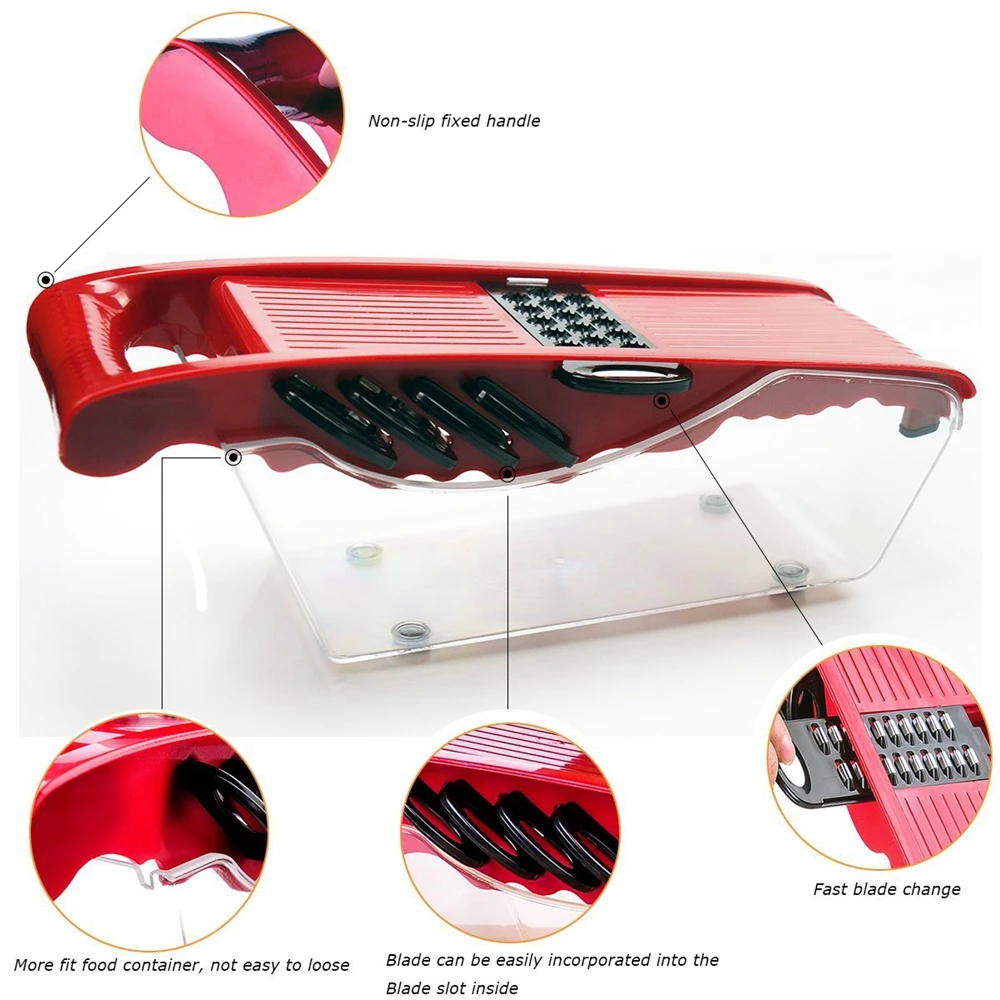 Информация о продукте Тип Кухонная посуда Материал Нержавеющая сталь, ABS Доступные цвета Красный Вес и размер Вес посылка 0,4900 кг Размер посылка (Д x Ш x В) 32,50x12,00x10,50 см/12,8x4,72x4,13 дюйма Упаковочный лист Содержимое посылка 1 x ломтерезка мандолина, 2 x прямой ломтерезка, 2 x ломтерезка, 1 x лезвие решетки, 1 x решетка, 1 x Сейф для рук, 1 x овощерезка