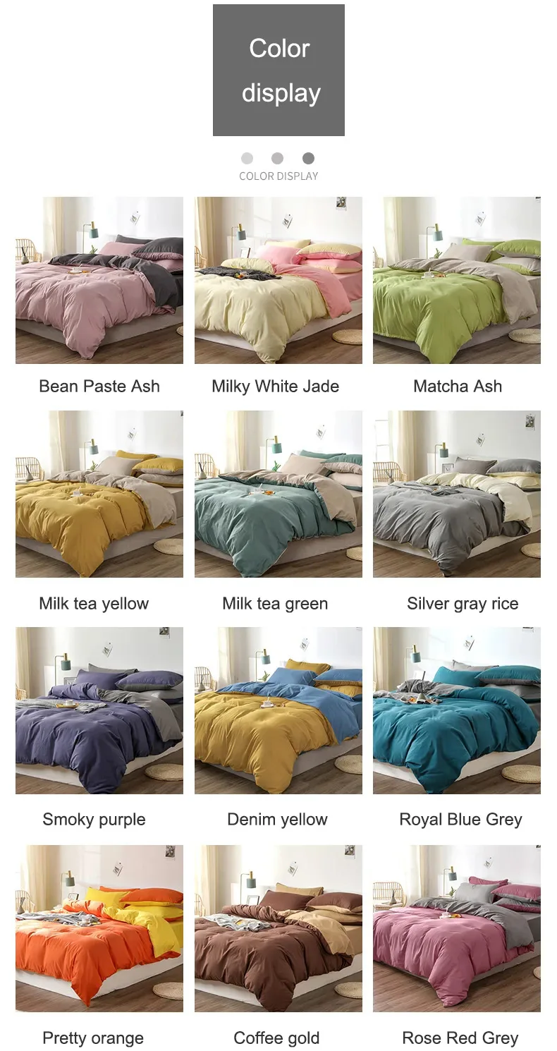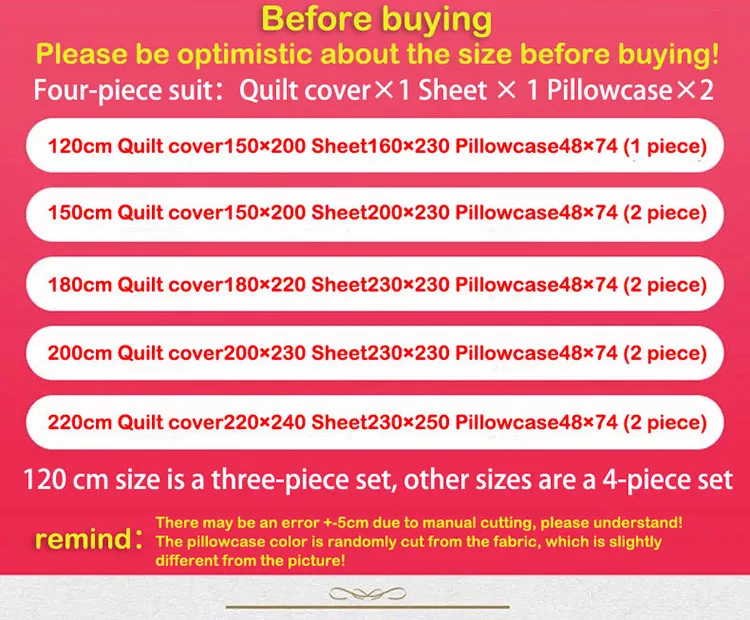 25 October 2020Show moreOpen 3 reviewsDescriptionWashing 1. Can be washed by machine 2. It is best to wash with water below 30 degree celcius 3. Please don't soak and mix with dark fabric Attention: Because of the shooting light, angle and color, physical and photos maybe some differences! Please confirm this information before purchasing. Inch size 120cm bed:47 inches Quilt cover 59×78 Sheet 62×90 Pillowcase18×29(1 piece) 150cm bed:59 inches Quilt cover 59×78 Sheet 78×90 Pillowcase18×29(1 piece) 180cm bed:70 inches Quilt cover 70×86 Sheet 90×90 Pillowcase18×29(1 piece) 200cm bed:78 inches Quilt cover 78×90 Sheet 90×90 Pillowcase18×29(1 piece)