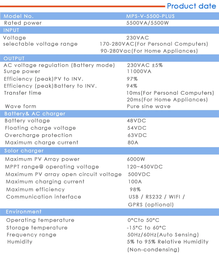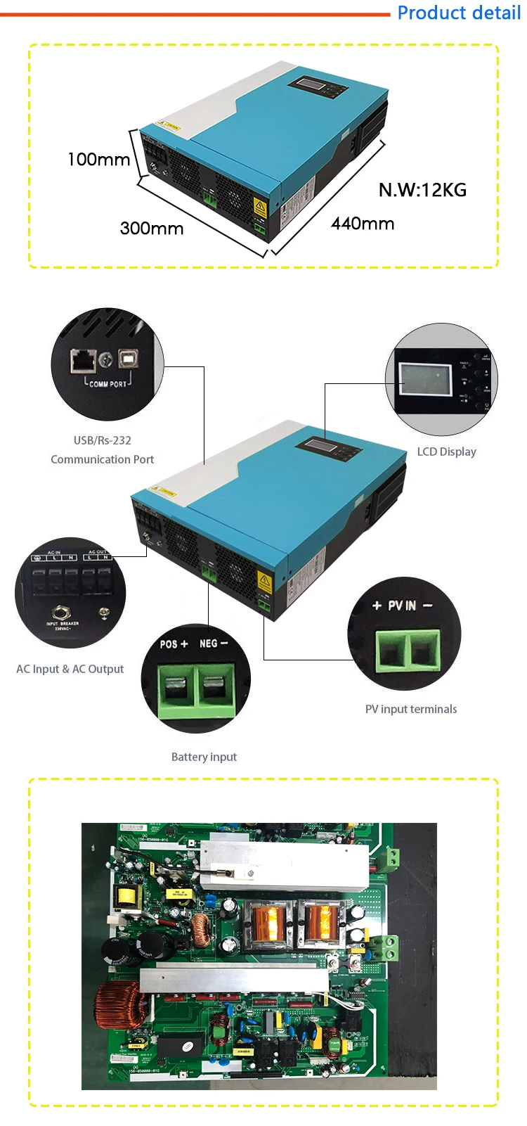 Это многофункциональный инвертор/зарядное устройство, сочетающее функции инвертора, MPPT Солнечное зарядное устройство и зарядное устройство для обеспечения бесперебойного питания с портативным размером.
