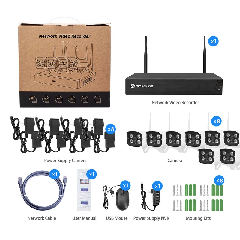 · 8CH 1080P Беспроводной NVR с 8 камерами · Гуманоидное распознавание · Используйте умное приложение Tuya или приложение Smart Life · Мобильное приложение для удаленного просмотра видео · Камера Фокусное расстояние: 3,6 мм, угол: 105 ° · Инфракрасное ночное видение · H.265 запись видео Водонепроницаемость камеры IP66 · Видео можно просмотреть После камеры и NVR включен · NVR не может быть подключен к другим Tuya Камеры. · Поддержка видео Предварительный просмотр/запись/воспроизведение/Резервное копирование USB · Поддержка Android/IOS/Pad удаленного просмотра, ПК Вид локальной сети · Сетевой протокол: UPNP, SMTP, PPPOE, DHCP и т. Д. · Получайте мгновенные оповещения по электронной почте при движении Обнаружен · 1 порт SATA, до 6 ТБ каждый, 1 порт USB 2,0 · Источник питания: DC12V1A