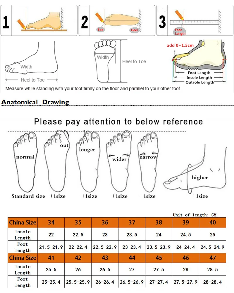Перед заказом Измерьте длину вашей стопы. Это очень важно! 1. Размер обуви-китайский размер. 2. Длина, соответствующая размеру,-это длина стельки, а не длина стопы. 3. Выберите правильный размер в соответствии с нашей таблицей размеров. 1. Измерение не совсем точное, возможна погрешность ± 5 мм. 2. Отображаемые цвета могут немного отличаться из-за разных компьютеров. 3. Из-за высокой стоимости международной экспресс-доставки, товары в посылка не содержат коробку. 4. Если у вас есть какие-либо вопросы, свяжитесь с нами, мы ответим вам как можно скорее. Спасибо за понимание и сотрудничество! Удачных покупок! Пожалуйста, измерьте свою ногу!