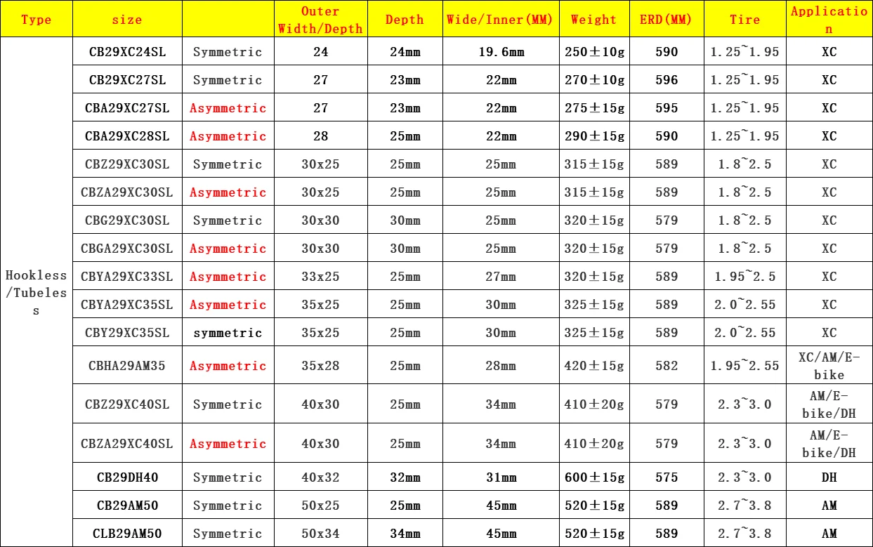 Асимметричная 29 "| Внешний 35 мм | Внутренний 30 мм | Глубина 25 мм | 310g | Эрд 589 мм | С прямыми закраинами бескамерная автомобильная шина | Шин 2,0" ~ 2,55 "| XC / Trail | 2,5 мм обод толщина губ