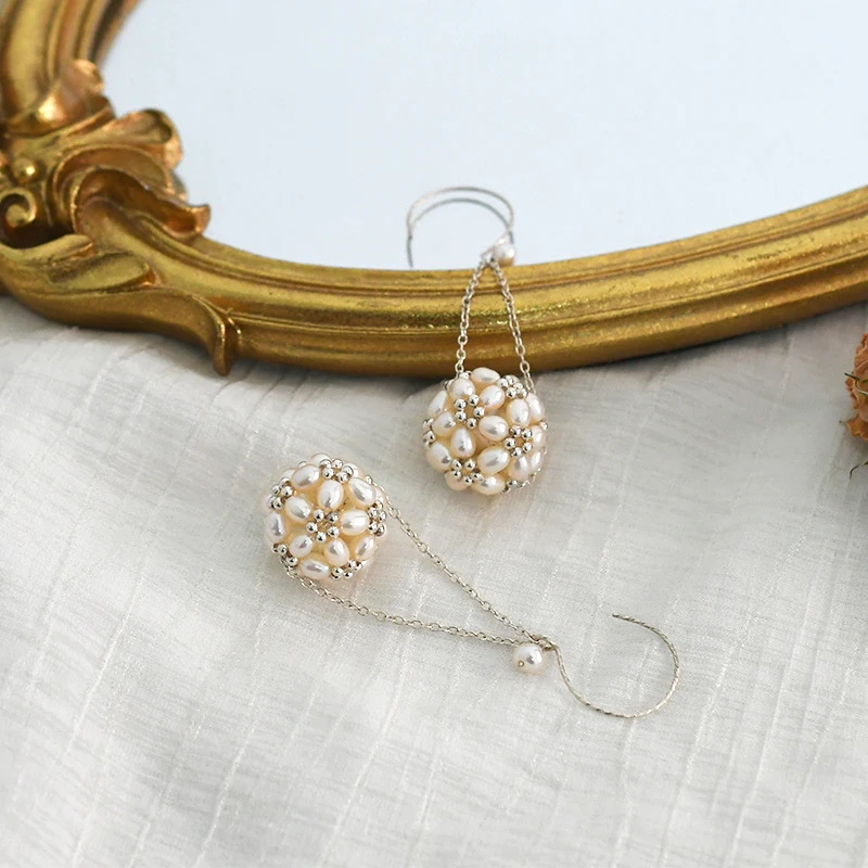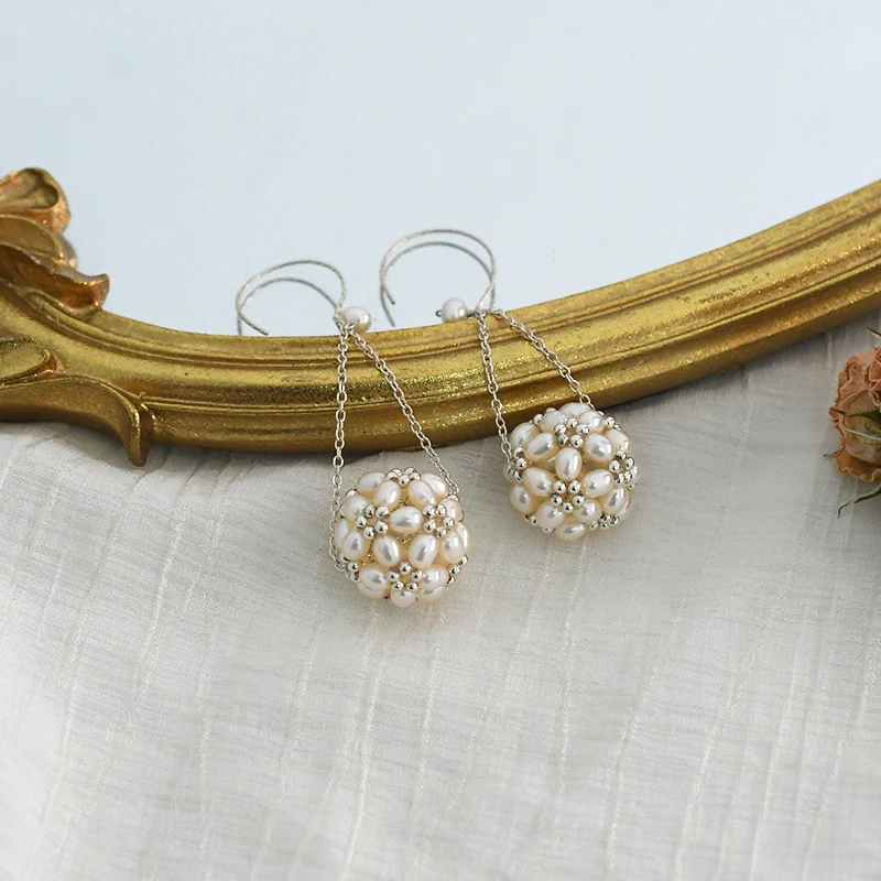 Очень сложная ручная вязка, пара сережек требует 120 серебряных бусин и 120 жемчужин. Все аксессуары 925 пробы серебра и натурального пресноводного жемчуга.